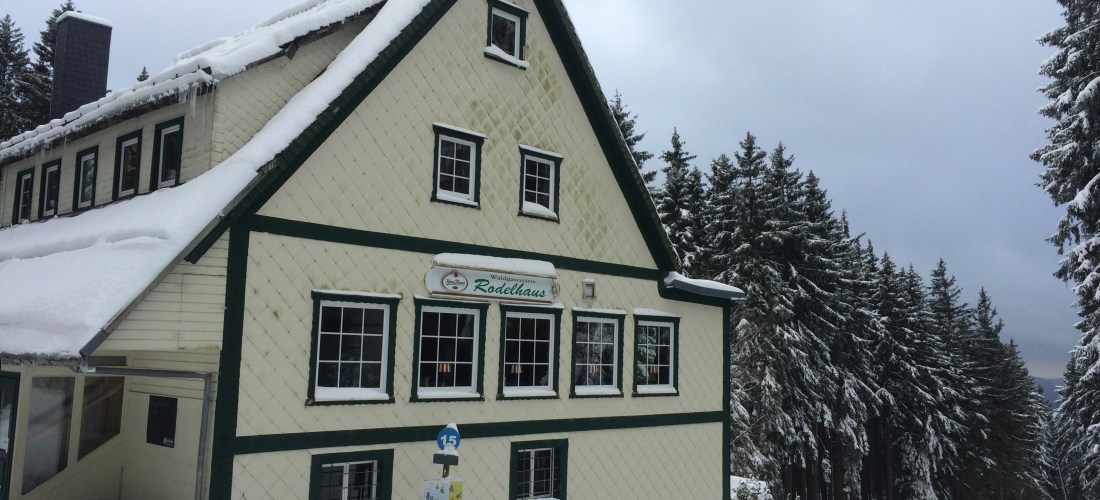 Wir wanderten vom Parkplatz aus etwa zweieinhalb Kilometer zur Waldgaststätte „Rodelhaus“, mussten zuvor aber den Weg wegen nicht eindeutiger Beschilderung suchen. M und ich waren im Februar 2013 schon einmal hier und rodelten damals rechts neben dem Haus den Hang hinunter. Im Rodelhaus angekommen, bestellten wir Getränke und Essen sowie eine Hundemahlzeit, bestehend aus einem Würstchen und einem Napf Wasser ❤ Ls Brei wurde erwärmt und auf einem kleinen Teller zu uns gebracht. Das Rodelhaus ist wirklich sehr hunde- und kinderfreundlich.