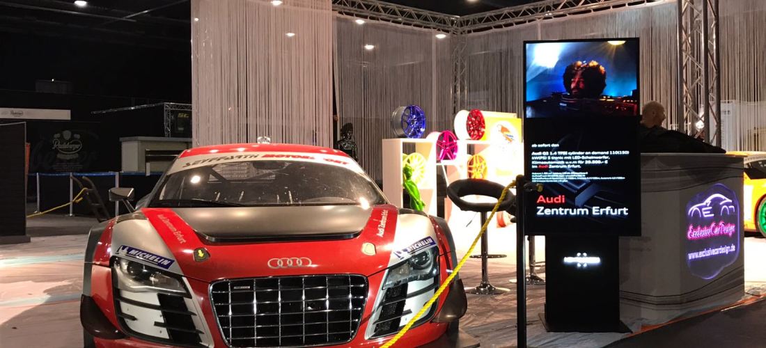 Wir suchten in Halle 1, in der sich ausschließlich Tuning-Aussteller befanden, zuerst den Stand von Exclusive Car Design auf, bei welchem M seinen NextScreen aufstellen konnte. Es war unglaublich voll und laut, aber die ausgestellten Fahrzeuge machten das wieder wett. L saß in ihrem Kinderwagen und schaute sich begeistert um.