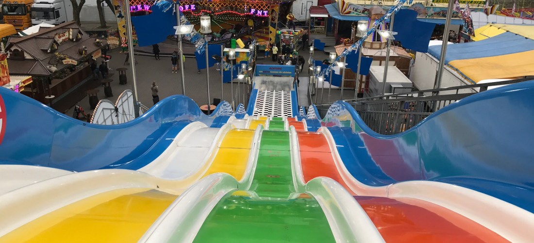 M rutschte zuerst auf einer Riesenrutsche, ich wenig später auch. Es war sehr witzig. Im nächsten Jahr können wir gemeinsam mit L rutschen. Da es allmählich richtig kalt wurde, holten M und ich uns nur noch einen vegetarischen Hotdog und fuhren anschließend mit dem Auto nach Hause. Für so kleine Kinder wie unsere L gab es insgesamt drei Fahrgeschäfte.