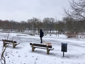 Kurz vor acht bereiteten M, L und ich das Frühstück vor und saßen bei angenehmer Musik zusammen am Tisch. Ich ging schnell duschen und machte mich anschließend mit Prinz auf den Weg in die verschneite Kälte. Eine Stunde lang spazierten wir im stellenweise spiegelglatten Park umher.