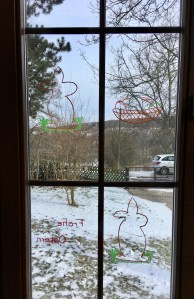 An vier Fenstern im Wintergarten probierte ich endlich meine neuen Kreidestifte aus. Ich bin mit der Qualität der Stifte äußerst zufrieden und hatte große Freude am Gestalten. Ich habe mich an einfachen Ostermotiven versucht. L hat mir sogar ein bisschen dabei geholfen ❤