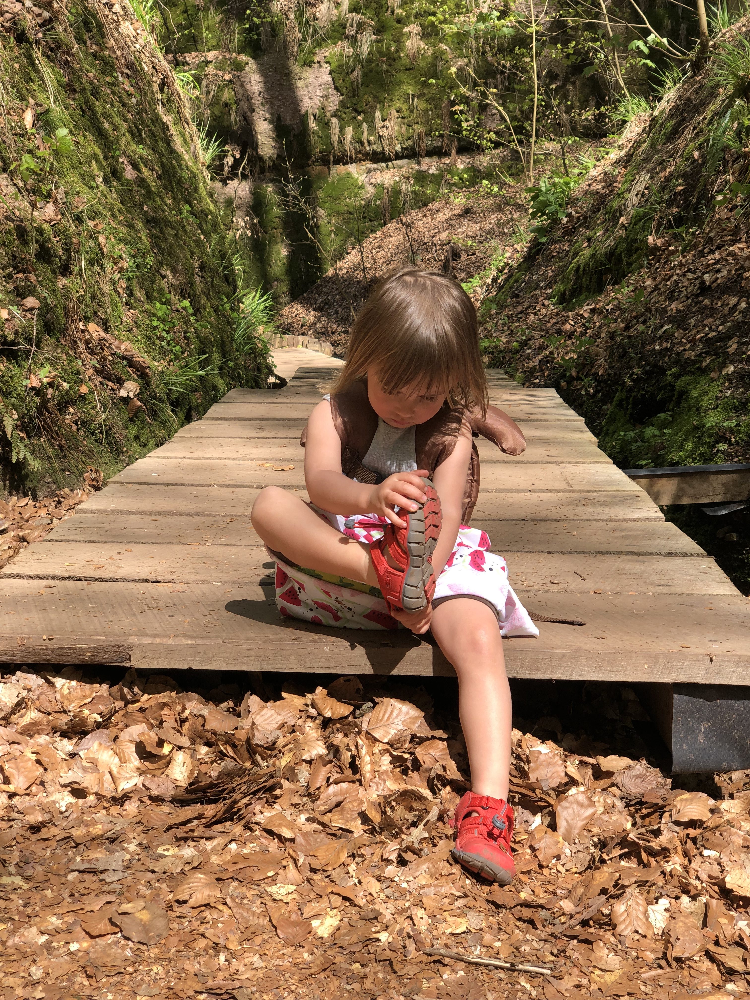 Gegen Ende des Weges durch die Drachenschlucht wurde es etwas matschiger. Sowohl Ls Kleid und Schuhe als auch meine Leggins und Barfuß-Schuhe hatten ihre Farbe gewechselt. M, der dummerweise ein Paar Turnschuhe mit eingerissener Sohle trug, bekam eine nasse Socke.