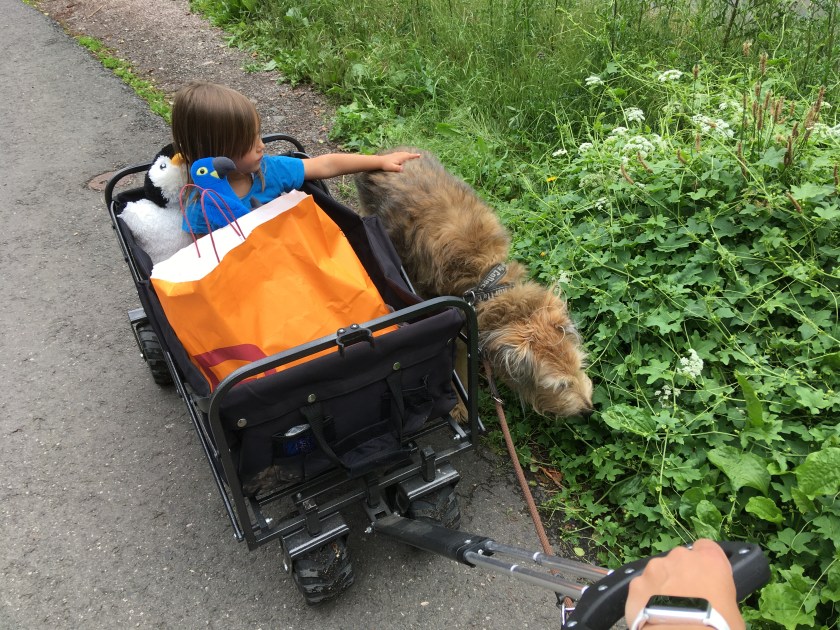 Am Vormittag lief ich mit Prinz und L im Bollerwagen zum Briefkasten und anschließend in den Park. Wir spielten auf der großen Wiese Feuerwehrmann Sam – eigentlich spielte das heute nur L. Ich konnte Prinz nicht dazu motivieren, sich großartig von der Stelle zu bewegen. Er hatte keine Lust. (Prinz übernimmt oft die Rolle des Hauptfeuerwehrmannes. 😉)