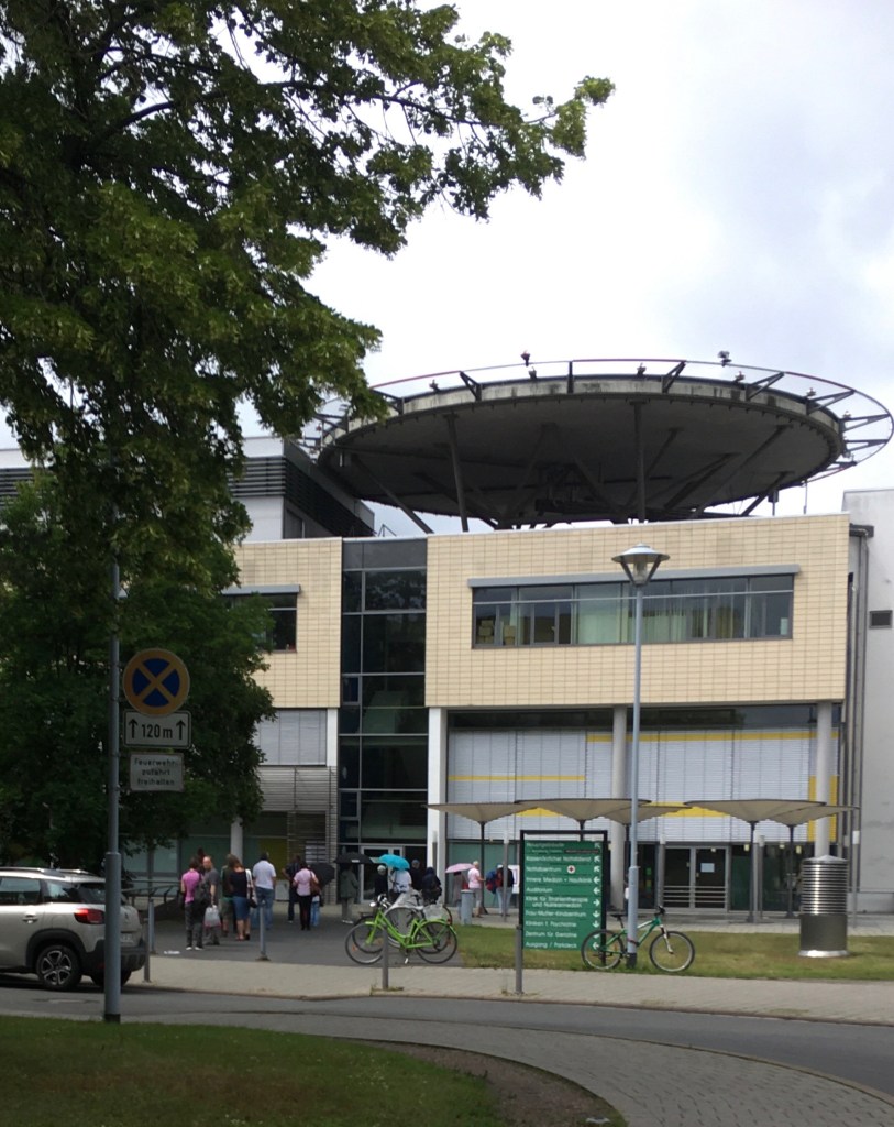 Am Nachmittag machte ich mich auf den Weg zu M ins Krankenhaus. Ich parkte wieder auf dem Parkplatz in der Nähe der Universitätssporthalle und lief die wenigen Meter zu Fuß. Ich betrat das Gebäude, in welchem M stationär untergebracht wurde, und erhielt vom Sicherheitsdienst den Hinweis, dass ich einen Besucherschein benötige. Der entsprechende Zettel sei bei der Pförtnerei direkt gegenüber erhältlich. Ich lief hinüber und wurde zum Haupthaus bzw. zur ehemaligen Cafeteria geschickt. Schon aus der Ferne erkannte ich die lange Warteschlange. Uff! Zum Glück ging es schnell voran. Ein kleiner Teil der Cafeteria wurde (provisorisch) zum Besucherzentrum umgebaut. Es dürfen sich maximal vier Personen gleichzeitig in diesem Bereich aufhalten. Nach dem Desinfizieren der Hände füllte ich einen Zettel aus, in dem ich angab, wen ich wo besuchen möchte, und versicherte, nicht an Corona erkrankt zu sein. Dieser Zettel muss bei jedem Besuch ausgefüllt werden. Sprich: Wenn ich M morgen wieder besuchen will, begebe ich mich zuerst in das Besucherzentrum. Interessant war für mich die Info, dass nur eine Person pro Tag zum Patienten auf die Station darf!