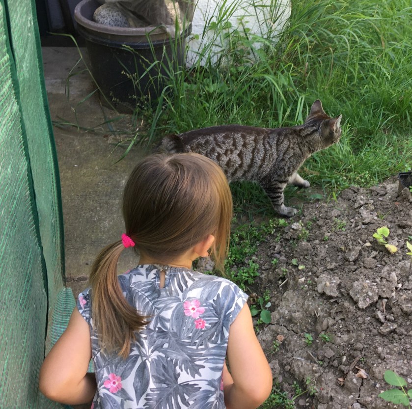 Als L und ich heute Morgen gemütlich draußen frühstückten, hörten wir eine Katze miauen. Natürlich machten wir uns gleich auf die Suche, woher diese Geräusche kamen. Es dauerte nicht lange, bis L und ich die süße Katze fanden. Was für eine Freude! L war ganz aus dem Häuschen. (Sie wünscht sich selbst eine eigene Katze.) Anfangs bekam Prinzi den Gast auf seinem Grundstück nicht mit. Ihm entging jedoch nicht, dass wir anderen uns merkwürdig verhielten. Er entdeckte die Katze, durfte sie allerdings nicht jagen. (Ich hielt ihn am Geschirr fest.) Ich wollte L den Spaß nicht verderben.