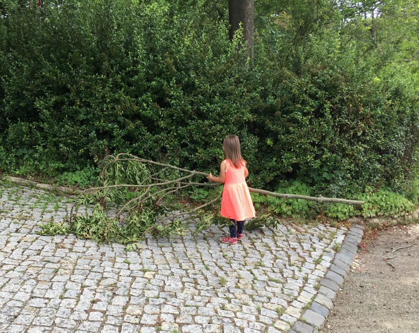 Am späten Vormittag liefen L, Prinzi und ich zum Briefkasten, um die von M geliehenen und mittlerweile geschauten Blu-rays zurückzuschicken, und anschließend in den Park. Begleitet hatte uns diesmal Ls Puppe Lotta oder Mia (der Name wechselt des Öfteren) im Puppenwagen. Obwohl L auf einem „Geheimweg“ Kontakt zu Brennnesseln hatte und wir wegen des Kühlakkus umgehend nach Hause gehen mussten, war es ein schöner Ausflug.