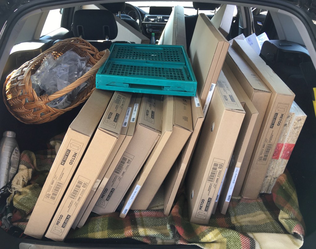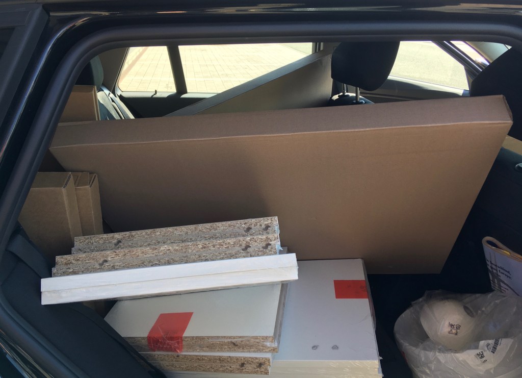 S und ich holten heute Morgen kurz nach um zehn die Kartons (Oberschränke) für die neue Küche ab. U und S nutzten am Vortag Click & Connect, sodass wir binnen fünf Minuten den Wagen zum Auto schieben und alles einladen konnten.