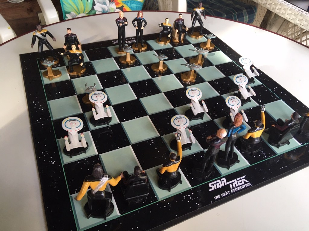 T fragte mich am Abend, ob wir Schach spielen wollen. (Letzten Sommer spielte ich auch schon gegen ihn.) Wir nutzten unser schönes Star Trek-Schachspiel. Obwohl ich mich aufgrund des Kinderlärms nur schwer konzentrieren konnte, gewann ich das Spiel. (Ich gehe aber davon aus, dass T mich früher oder später schlagen wird. Ich spiele sehr selten bis nie und er regelmäßiger. Außerdem wird T im August auch „erst“ zehn …)