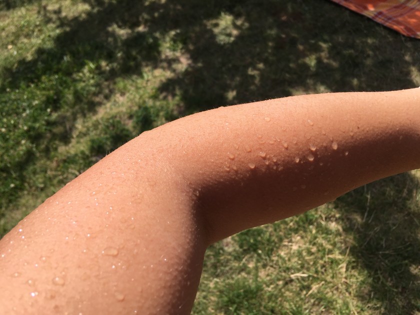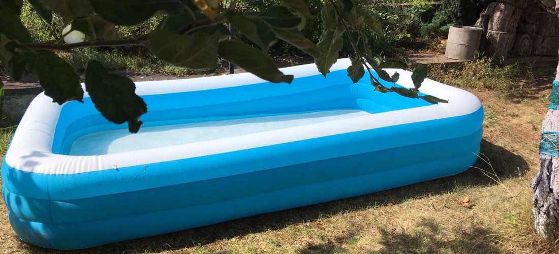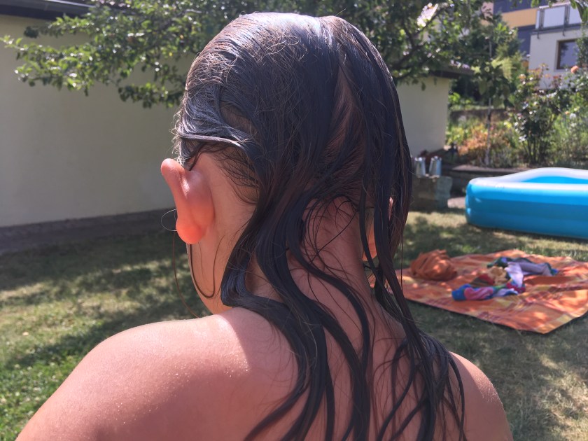 Gleich am Vormittag pumpte unsere Vermieterin C den großen Pool (das große Planschbecken) auf und ließ frisches Wasser hinein. Am frühen Nachmittag spielte ich mehrere Stunden gemeinsam mit L im Wasser. Wir spritzen uns gegenseitig nass, übten aber hin und wieder auch die Schwimmbewegungen. Zwischendurch machten wir es uns auf der Picknickdecke gemütlich und lasen einige Bücher.