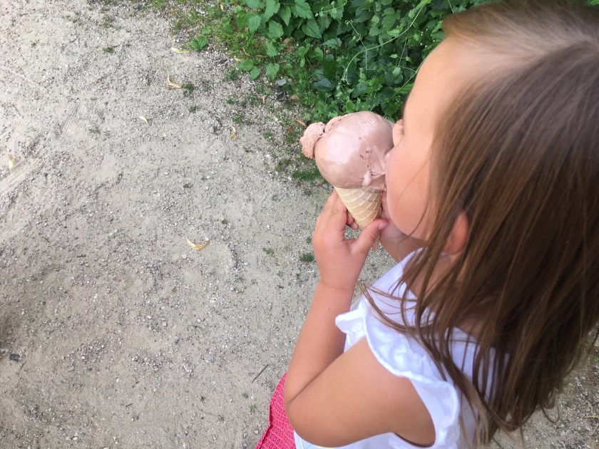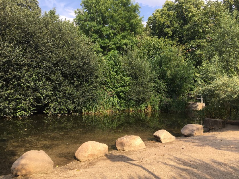 Gegen 17:00 Uhr beschlossen L und ich, mit Prinzi im Park spazieren zu gehen. Die Sonne war bereits seit einiger Zeit von Wolken bedeckt und ein leichter Wind war aufgezogen. Ideales Spaziergang-Wetter für Prinzi. Wir schauten, ob der Eiswagen der Bäckerei Rüger im Park stand (nein), und liefen weiter zum Espachcafé. L bekam ein Schokoladeneis, durfte im Wasser planschen und auf dem Spielplatz spielen. Prinz lief recht gut mit. Die Fahrradfahrer im Park waren ein wenig nervig/anstrengend. Ansonsten war es überraschend leer. Ich fragte mich, wo die Leute heute alle waren.
