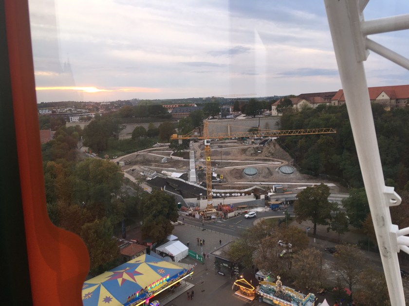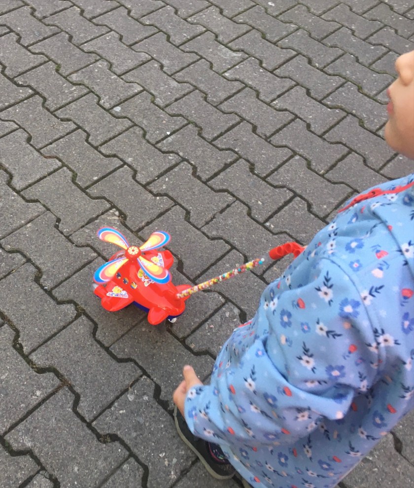 Die Ampel am Einlass stand auf grün. (Das bedeutet, dass unter zweitausend Besucher anwesend waren. L und ich mussten somit nicht warten.) Trotz Außenbereich und Frischluft müssen alle Besucher ab sieben Jahren während der Dauer ihres Aufenthalts eine Maske tragen. Beim Einlass zeigte ich meine Online-Registrierung und wir durften passieren. L und ich fuhren heute mit jedem Fahrgeschäft, das ihrem Alter entsprechend war. Sie gewann außerdem beim Entenangeln und Dartpfeile auf Luftballons werfen zwei Kuscheltiere (wir haben ja auch so wenige) und schwatzte mir am Süßigkeitenstand ein Flugzeug (neun (!!) Euro) ab.