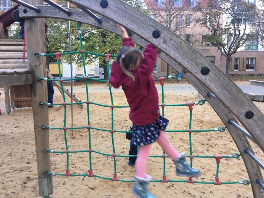 Die Resthelligkeit am heutigen Nachmittag nutzten L und ich, um direkt nach dem Kindergarten den Kikaninchen-Spielplatz zu besuchen. L durfte mit ihrem Roller fahren. Auf dem Spielplatz traf L eine Freundin aus der Nachbargruppe ihres Kindergartens. Die beiden Mädchen spielten mit mir verstecken.
