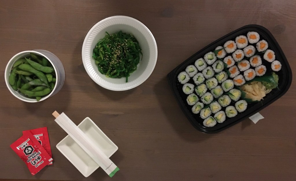 Zur Belohnung (für was auch immer) bestellte ich mir heute beim Lieferservice meines Vertrauens (mal wieder) eine Portion veganes Sushi. Lecker! (L ist bei Ms Mama. Es ist wieder Oma-Dienstag.)