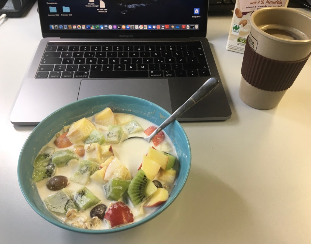 Am Mittwoch veranstalteten wir erneut unser monatliches Teamfrühstück – leider aufgrund der Corona-Pandemie nur remote. Bei laufenden Kameras aßen wir unser Frühstück und tauschten uns über Dies und Das aus. Das meiste hatte ich zu verkünden/erzählen. Obwohl ich dieses Event wieder gut gelungen fand, werde ich mir für den Januar überlegen, wie wir es ein wenig aufpeppen oder lockerer gestalten können.