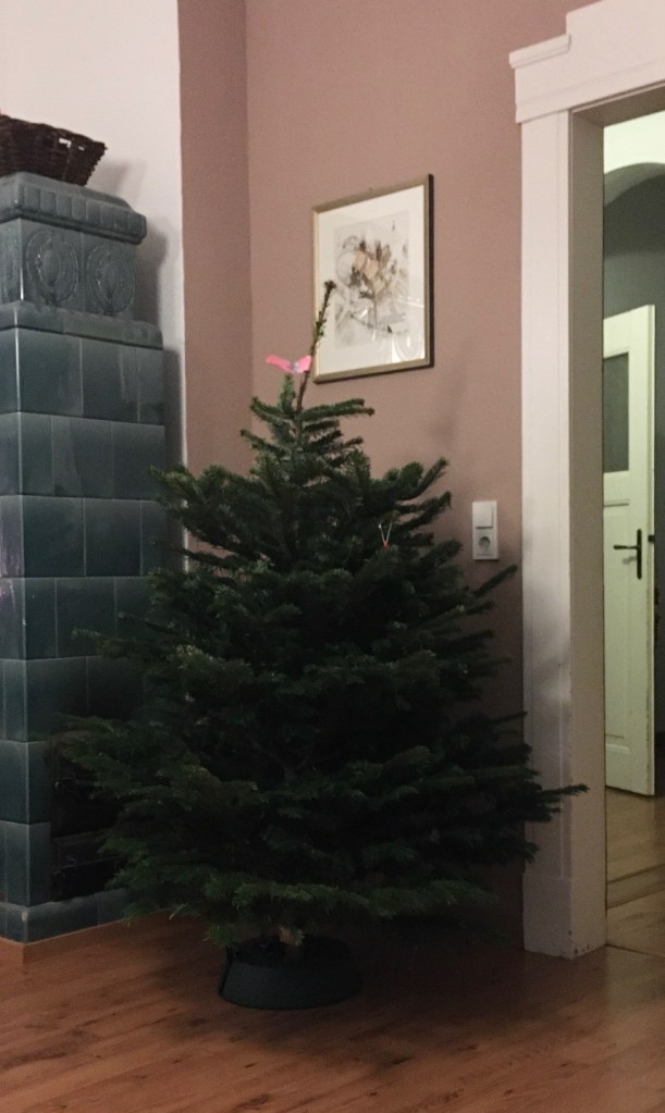Ich hielt mich dieses Jahr für besonders clever und bestellte Ls und meinen Weihnachtsbaum über Fleurop. (Der Gedanke an ein vollgenadeltes Auto und langes Schleppen durch die halbe Welt schreckte mich ab.) Nicht bedacht hatte ich allerdings, dass die Paketzusteller wie jedes Jahr in der Weihnachtszeit übermäßig viel zu tun haben. Der Baum sollte am 5. Dezember ankommen, wurde letztendlich erst am 8. Dezember geliefert. Trotz allem kam der Weihnachtsbaum in einem guten Zustand bei uns zu Hause an.
