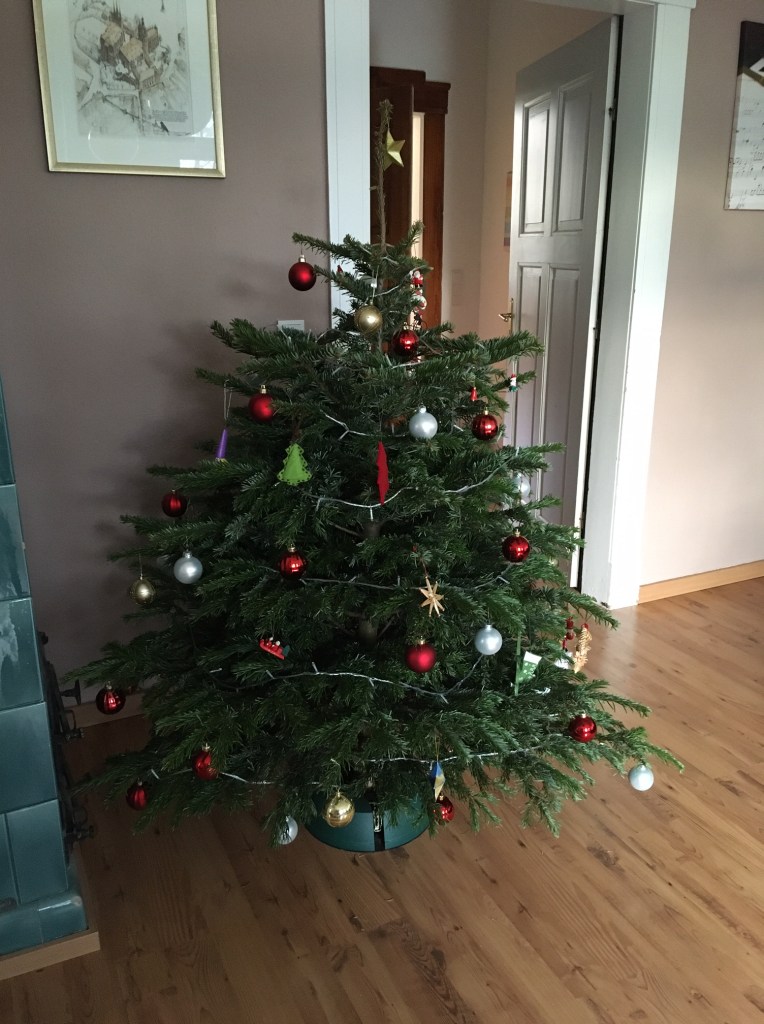 Nach dem Schmücken hatte die im vergangenen Jahr gekaufte Lichterkette noch etwa fünf Minuten Lust, den Baum erstrahlen zu lassen, und gab dann ihren Geist auf. Gerade als ich eine neue bestellt hatte, funktionierte sie plötzlich wieder. Ich stornierte meine Bestellung, nur um wenig später festzustellen, dass die Lichterkette nun überhaupt nicht mehr funktioniert. Und weil ich einfach keine Lust und Motivation mehr hatte, leuchtete unser Baum in diesem Jahr eben mal nicht. Es gibt schlimmeres …