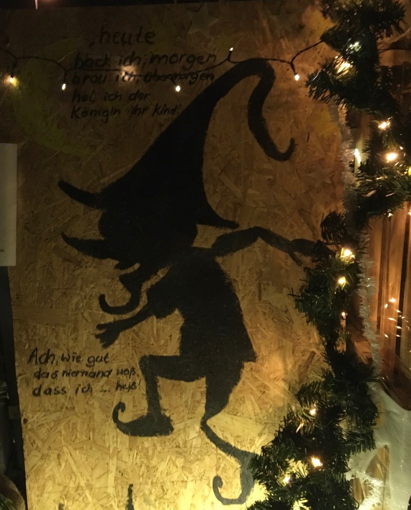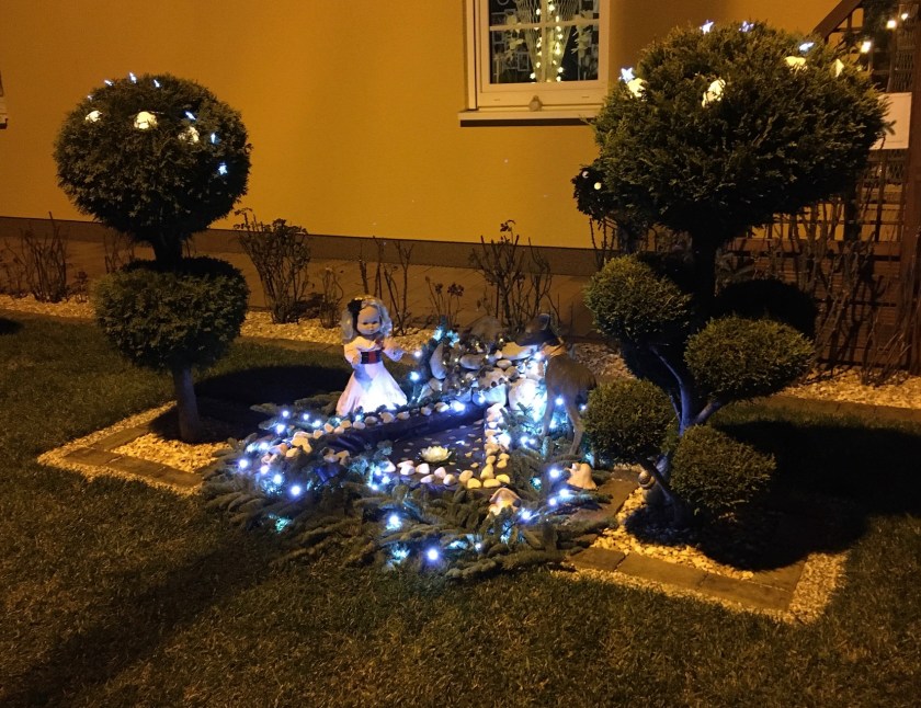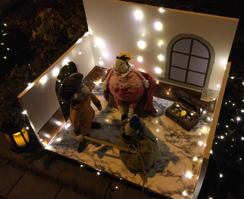 Am dritten Advent spazierten Ms Mama, L und ich abends durch Niedernissa. Der Ort hatte sich das vierte oder fünfte Jahr infolge etwas schönes einfallen lassen: einen Adventskalender in Märchenform. Jeden Abend wird vor einem anderen Haus ein zusätzliches Märchen ausgestellt, somit vierundzwanzig insgesamt. So schön die Idee auch ist, es waren einfach unglaublich viele Leute unterwegs. Es war stellenweise sehr schwer, genug Abstand zu halten. Mir wurde das schnell zu viel. (Ich kann mir dennoch vorstellen, nächstes Jahr in der Adventszeit mit L wieder hinzufahren.)
