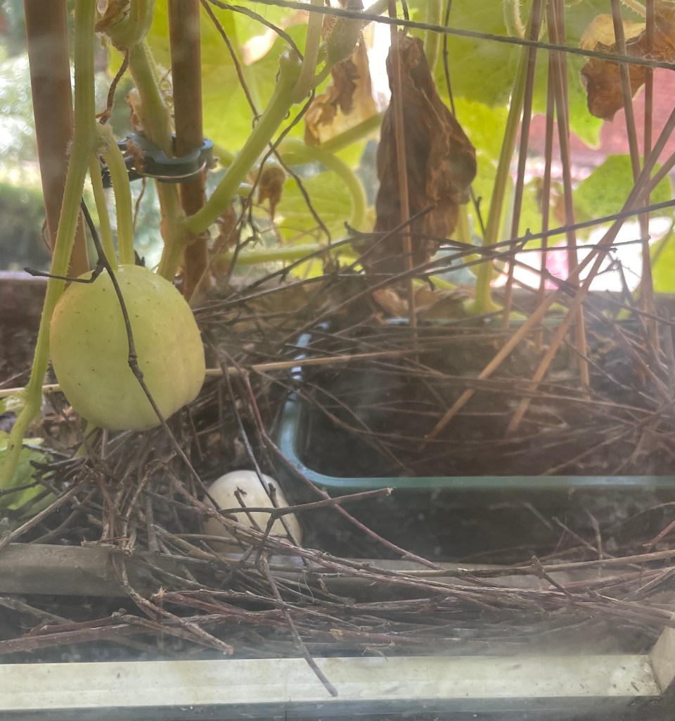 Meine Eltern waren am letzten Wochenende im Urlaub in Rüdesheim am Rhein. In dieser Zeit kümmerte ich mich zusammen mit L um ihre zwei Vögelchen. Mein Papa hat auf einem Fenstersims im Gästezimmer einen Blumentopf stehen, in dem er gelbe Gurken zieht. Ein Taubenpärchen hat sich diesen Blumentopf nun zum Bau eines Vogelnestes geschnappt. Ein Ei konnten L und ich darin schon entdecken. ❤