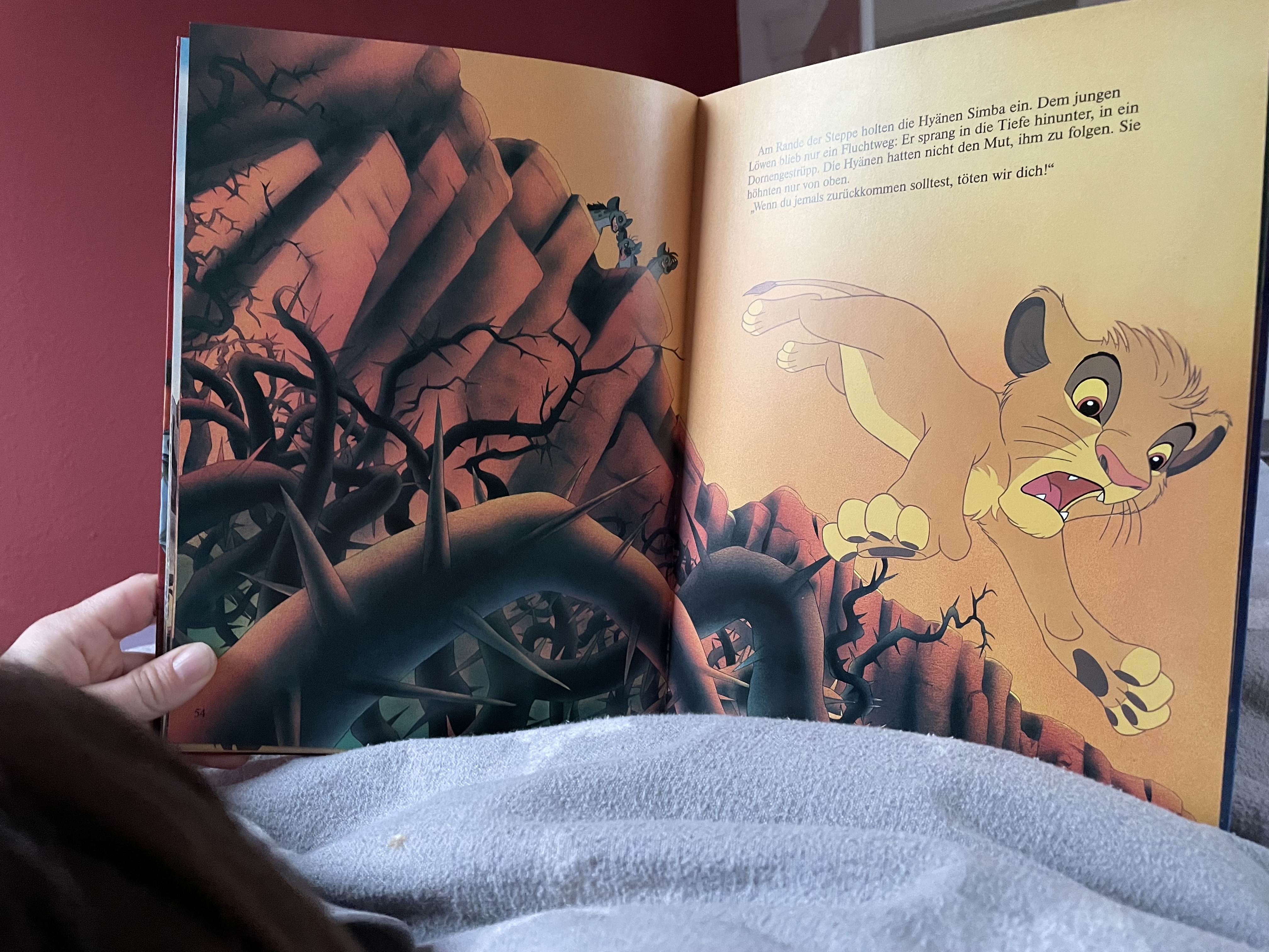Nach wenigen Minuten kam L mit einem Buch wieder ins Schlafzimmer zurück, verhielt sich normal, ließ sich knuddeln und alles Merkwürdige zuvor war vergessen. Wir lasen im Buch König der Löwen weiter. L kramte irgendwann zwei Hasenkuscheltiere hervor und spielte mit mir Kindergarten. (Ich war die Erzieherin.) Ich nutzte das Spiel, bei dem ich eher eine passive Rolle innehatte, für ein paar Duolingo-Übungen.