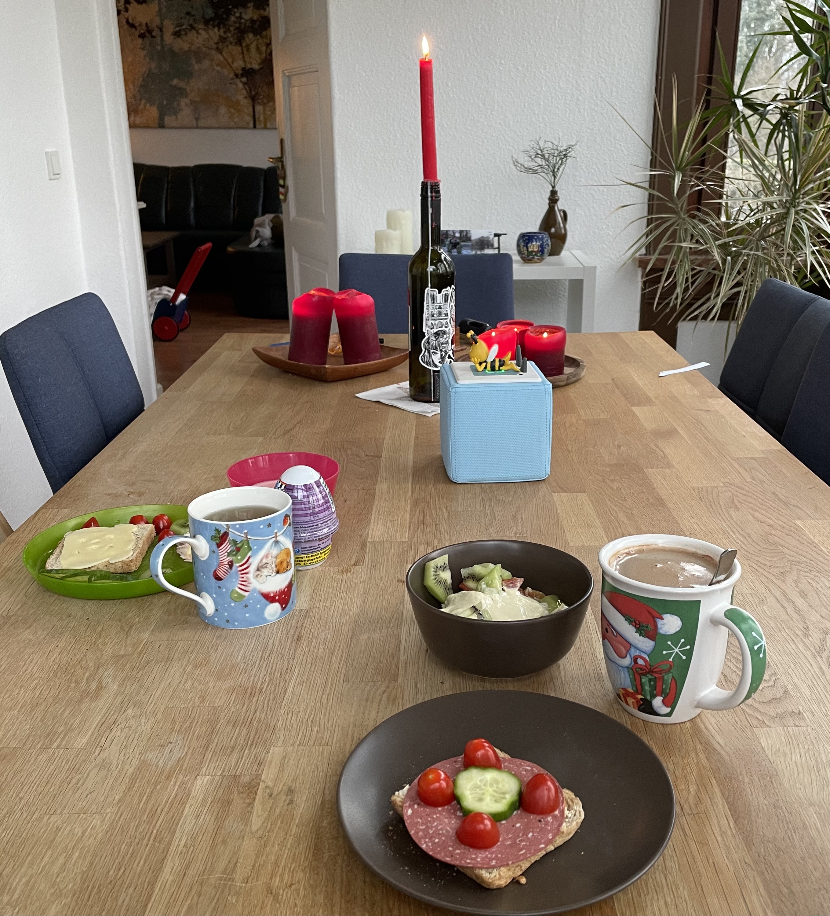 Am Abend saßen wir gemeinsam im Esszimmer. Ich fand nach Monaten endlich die Gelegenheit, in einem Buch, das L einmal von mir geschenkt bekommen soll, weiterzuarbeiten. L probierte einige Lernapps auf dem iPad aus. Hunger auf Abendessen hatten wir beide nicht.