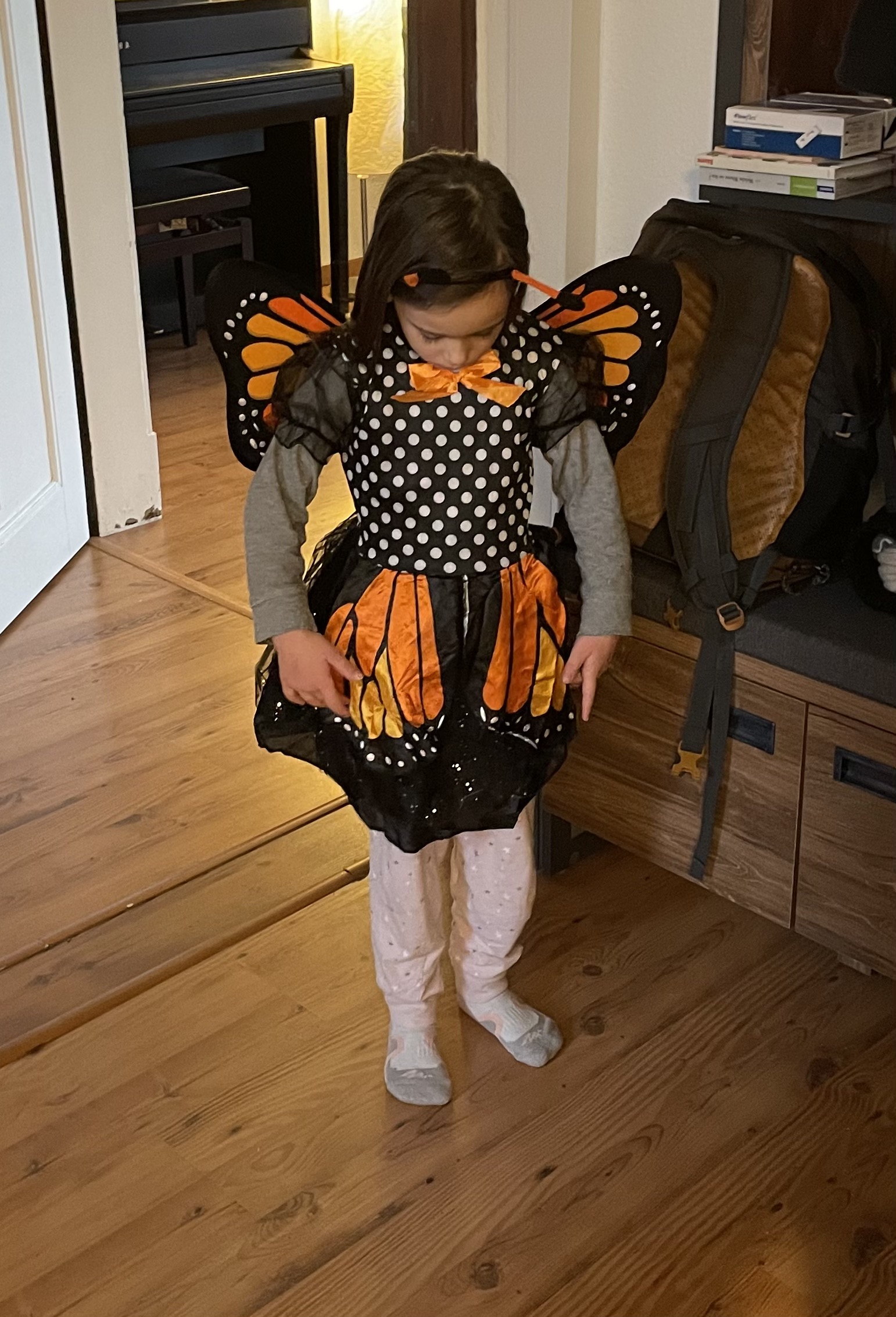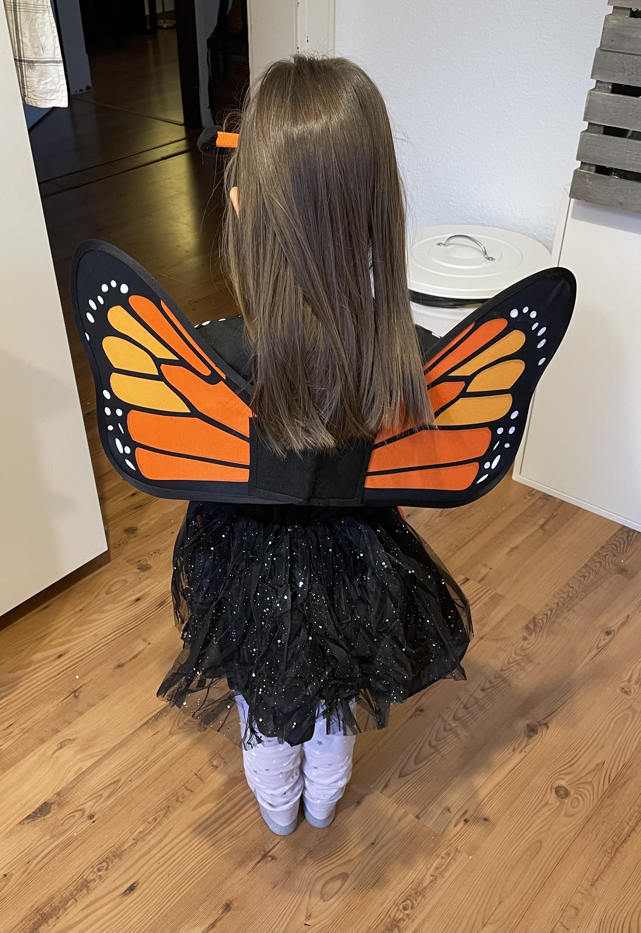 Kurz nach neun stand ich auf und bereitete das Frühstück vor. Vom Esszimmer aus konnten L und ich wenig später das Postauto sehen und die zwei Postbotinnen beobachten, wie sie zwei kleine Päckchen auf die Mülltonnen legten. L war voller Vorfreude, erwarten wir doch neue Hausschuhe für den Kindergarten. Wir brachten nach dem Frühstück den Müll raus und nahmen die Päckchen mit herein. Eines war nicht für uns, sondern für C. Doch in dem zweiten befand sich Ls Kostüm für das diesjährige Faschingsfest im Kindergarten. (L möchte ein Schmetterling sein.) Ihre Freude war natürlich groß und sie wollte das Kostüm gleich anprobieren. Es passte und hinterließ ordentlich Glitzer in sämtlichen Räumen unserer Wohnung. 😉