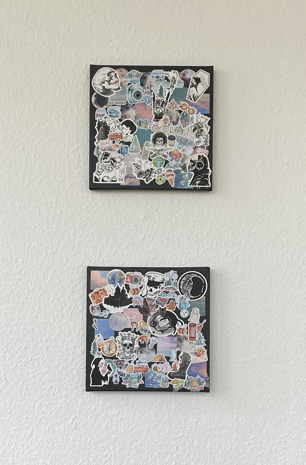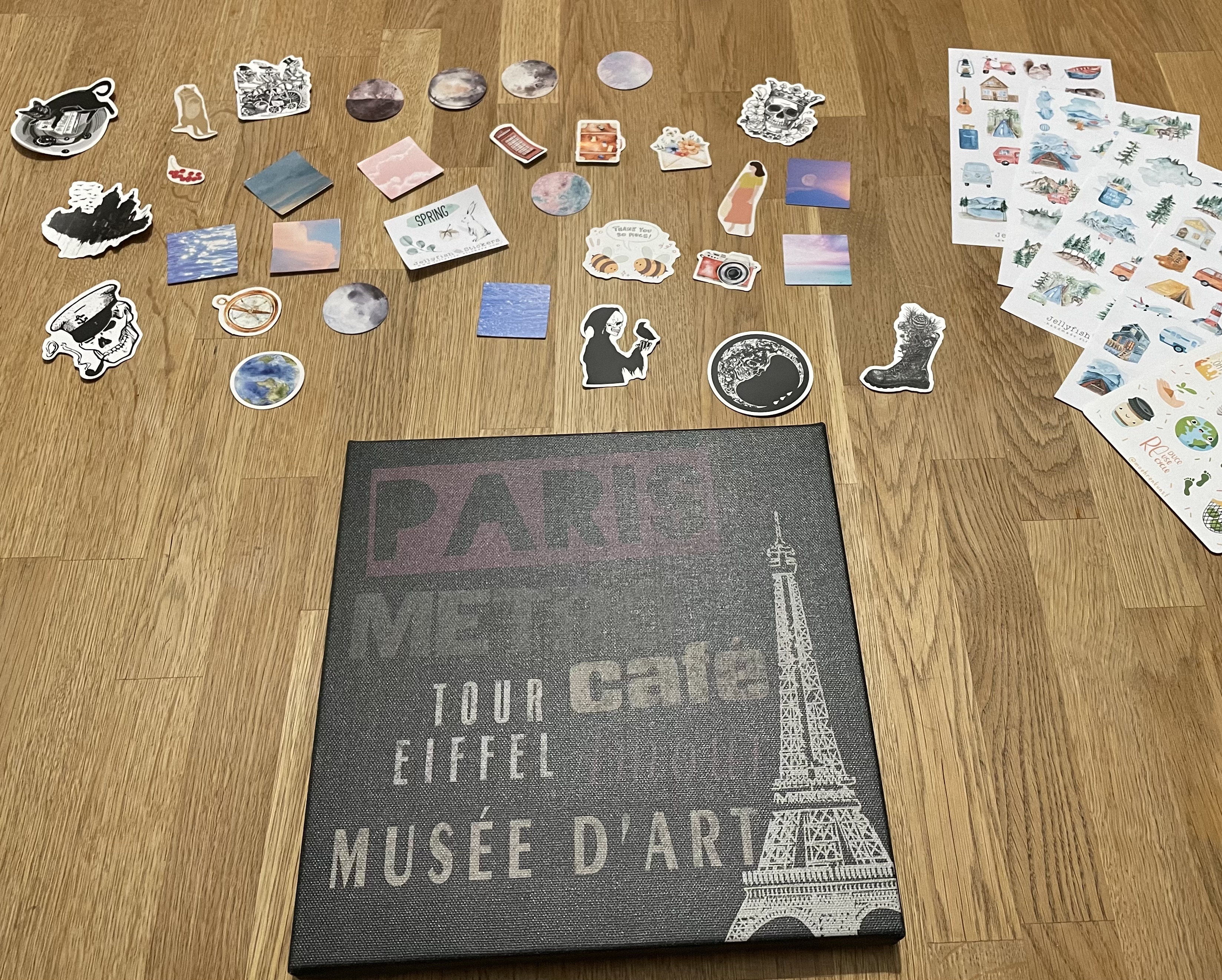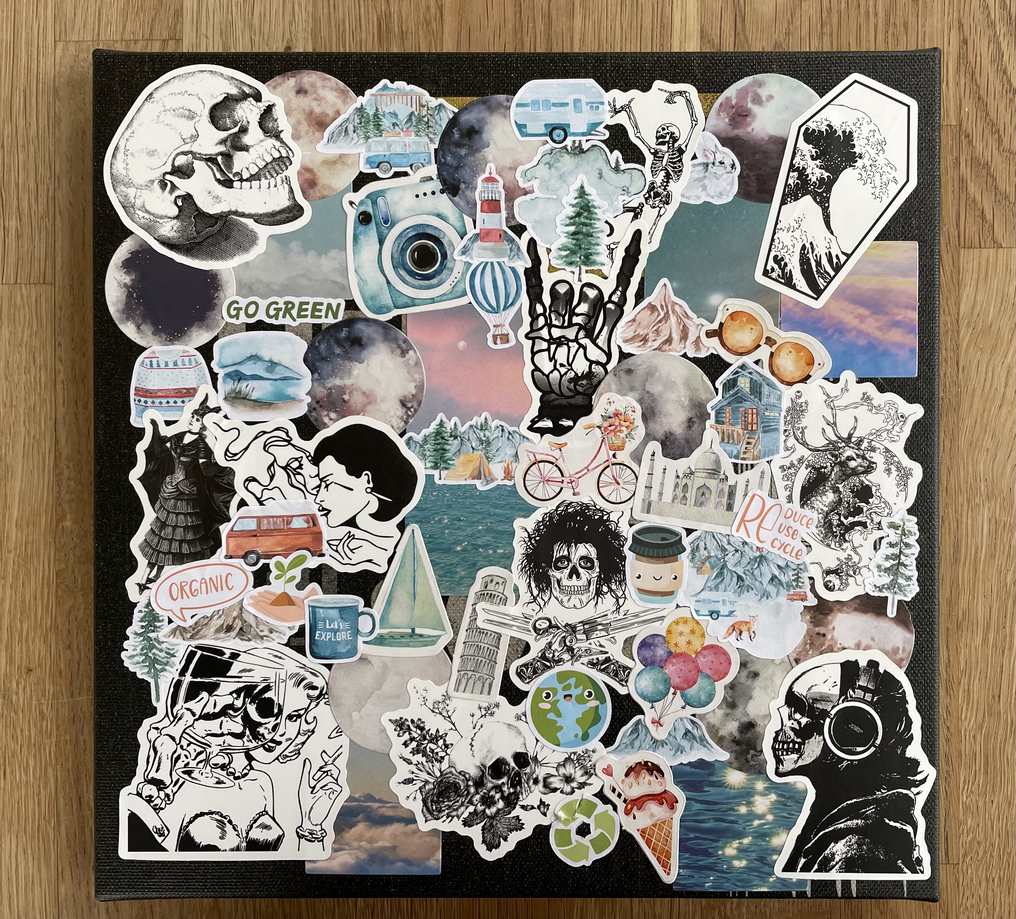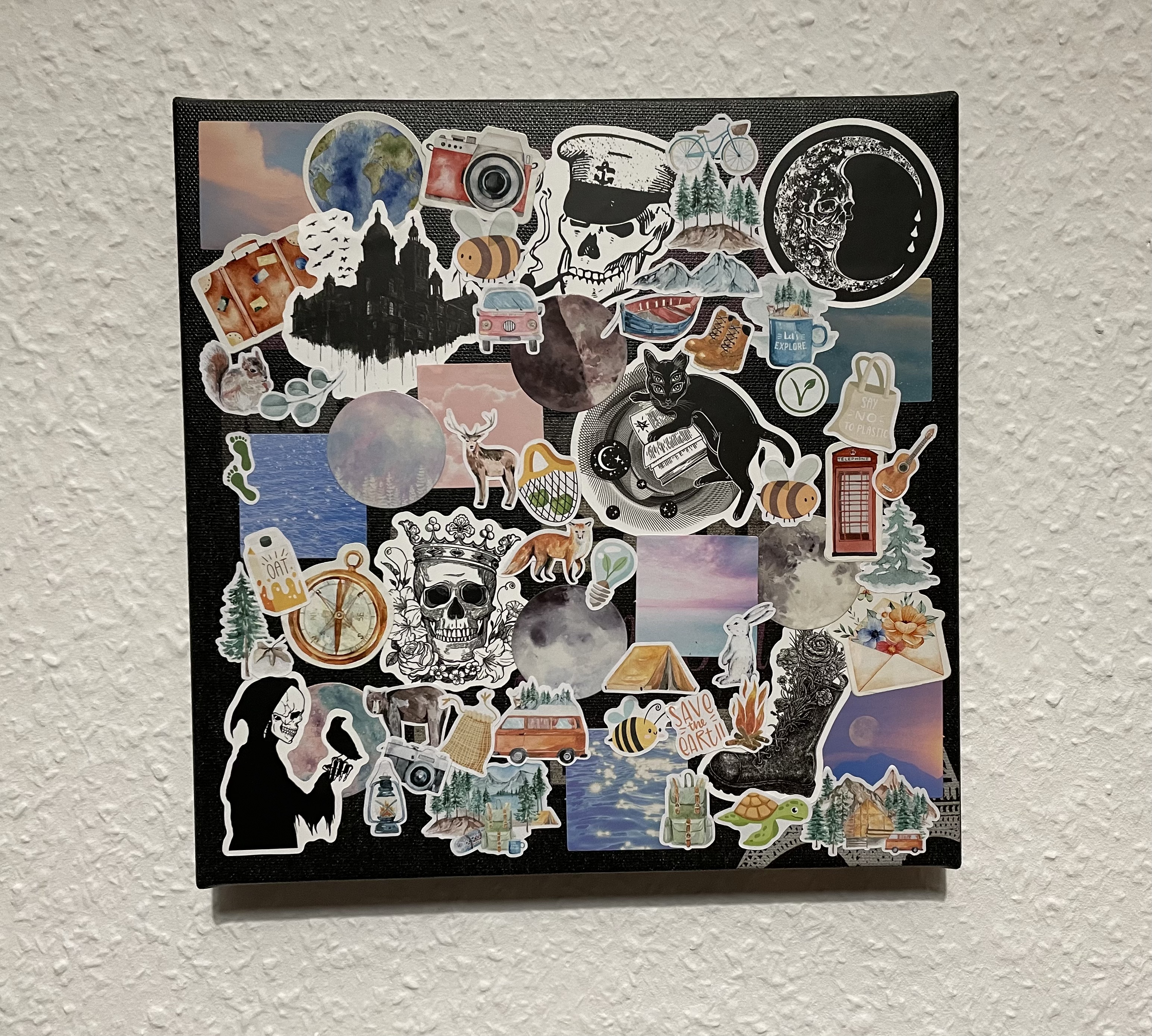 L durfte am frühen Abend einen der vielen Bibi & Tina Filme zu Ende schauen. Ich nutzte die Zeit und sortierte für ein kleines Projekt vorhandene und neu eingetroffene Sticker. Da L hungrig war, bereitete ich zunächst unser Abendessen zu, futterte entspannt mit ihr und machte mich anschließend an die Umsetzung. Vor zig Jahren kaufte ich – bei Nanu Nana denke ich – drei kleine Leinwände. Die Motive gefallen mir jedoch nicht mehr so gut. Wegschmeißen möchte ich die Leinwände aber auch nicht. Deshalb hatte ich die Idee, das ursprüngliche Motiv mit Stickern zu verschiedenen Themen zu überkleben. Das neue Bild ist wirklich ein wenig „wild“ geworden. Mir gefällt es aber total. Es passt zu mir. Die anderen beiden werden demnächst auch „wild“ werden.