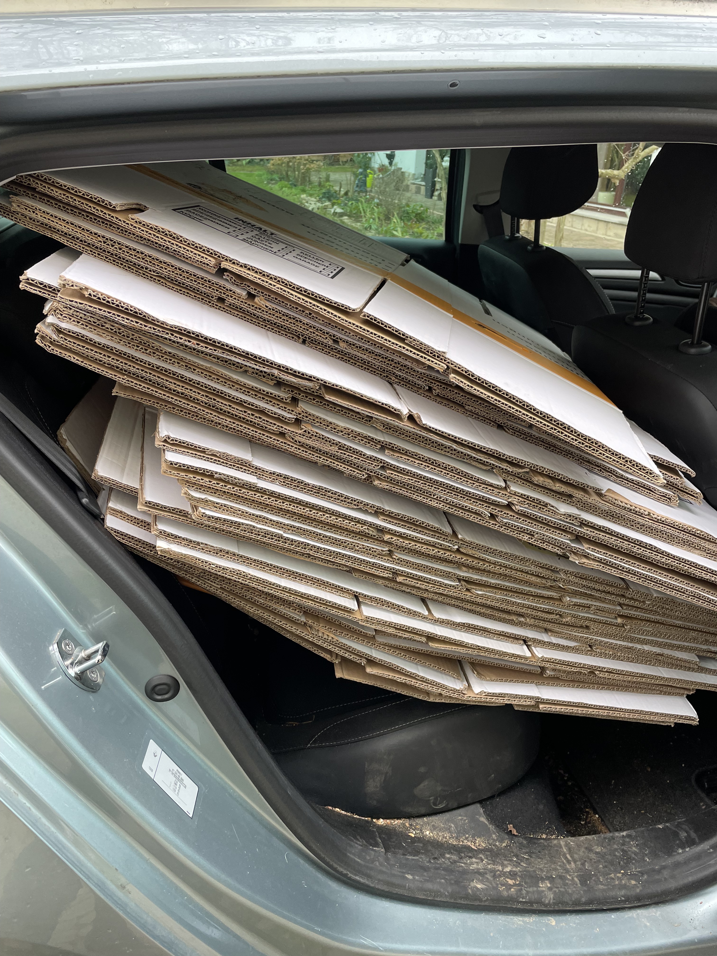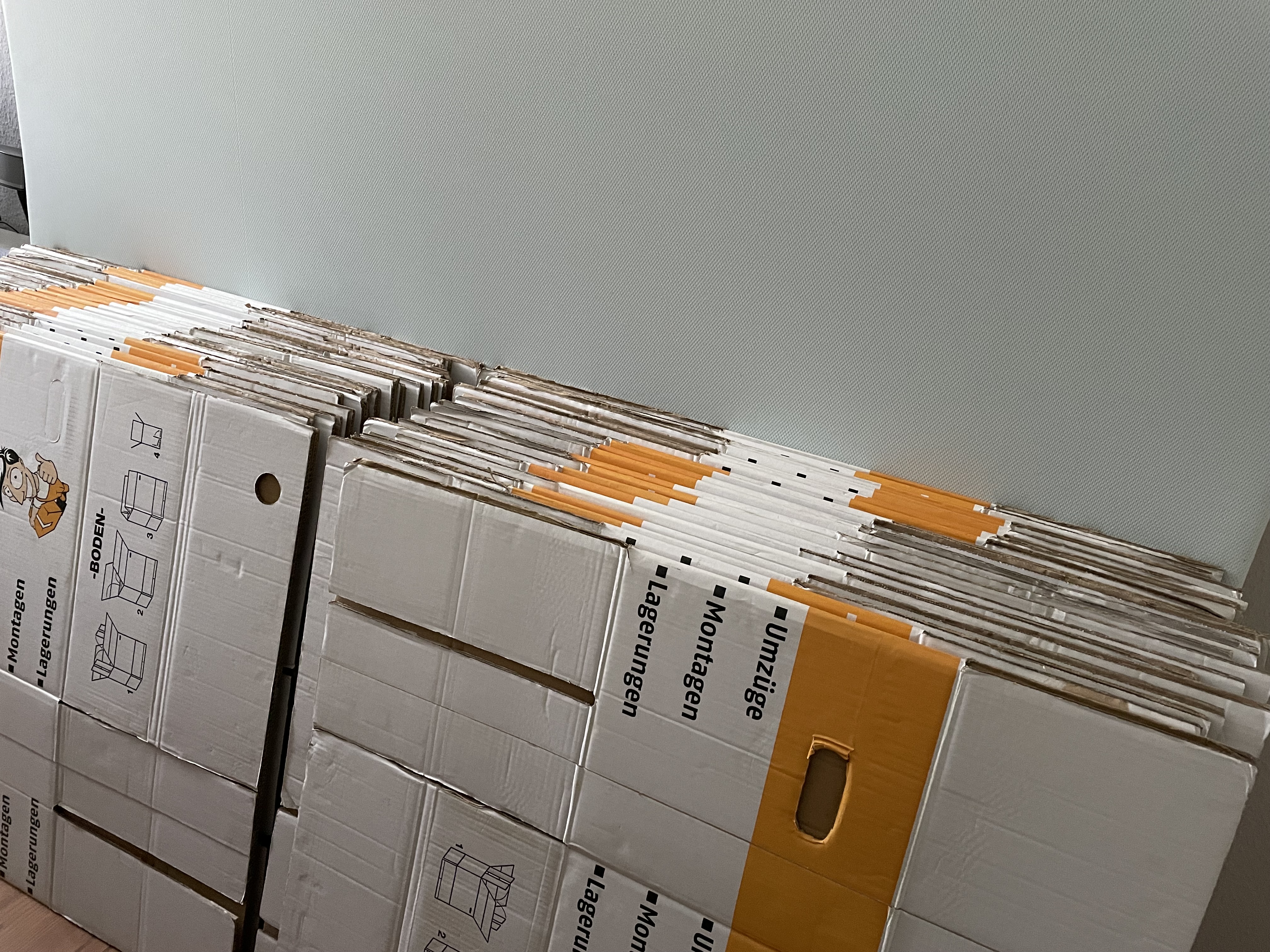 Um elf war es Zeit, sich anzuziehen und kurz ins Bad zu gehen. Halb zwölf war ich in der Innenstadt zur Abholung von vierzig Umzugskartons verabredet. Ich bin im Nachhinein froh, nicht die angebotenen sechzig Kartons genommen zu haben. Ich brauchte eine Weile, um alle vierzig Kartons im Auto zu verstauen. Hätte ich früher geschaltet, wie viel Platz die Umzugskartons benötigen, hätte ich die Rücksitzbank umgelegt. L saß auf dem Rückweg neben mir auf dem Beifahrersitz und die Kartons waren aufgeteilt auf Kofferraum und Rücksitzbank.