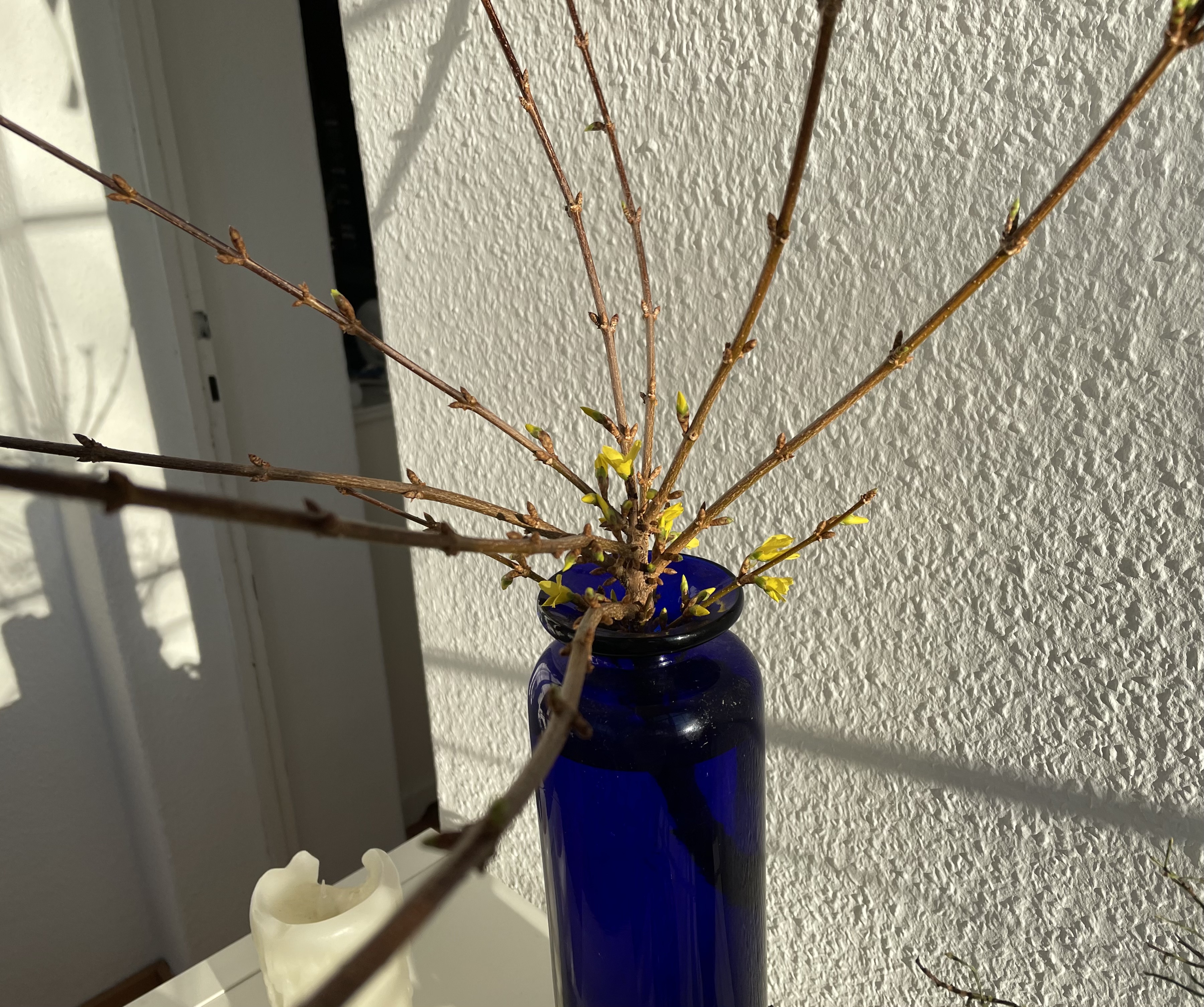 Dann war es für uns aber höchste Zeit aufzustehen, denn wir waren halb elf bereits verabredet. Während L mit ihren Inline Skates durch die Wohnung sauste, bereitete ich unser Frühstück und ein kleines Picknick für unterwegs vor. Im sonnigen Wintergarten bei einem Sandelholz-Räucherstäbchen ließen wir uns unser Essen schmecken. Beim Abräumen entdeckte ich bei einigen Zweigen aus unserem Garten erste Blüten. Es wird allmählich Frühling.