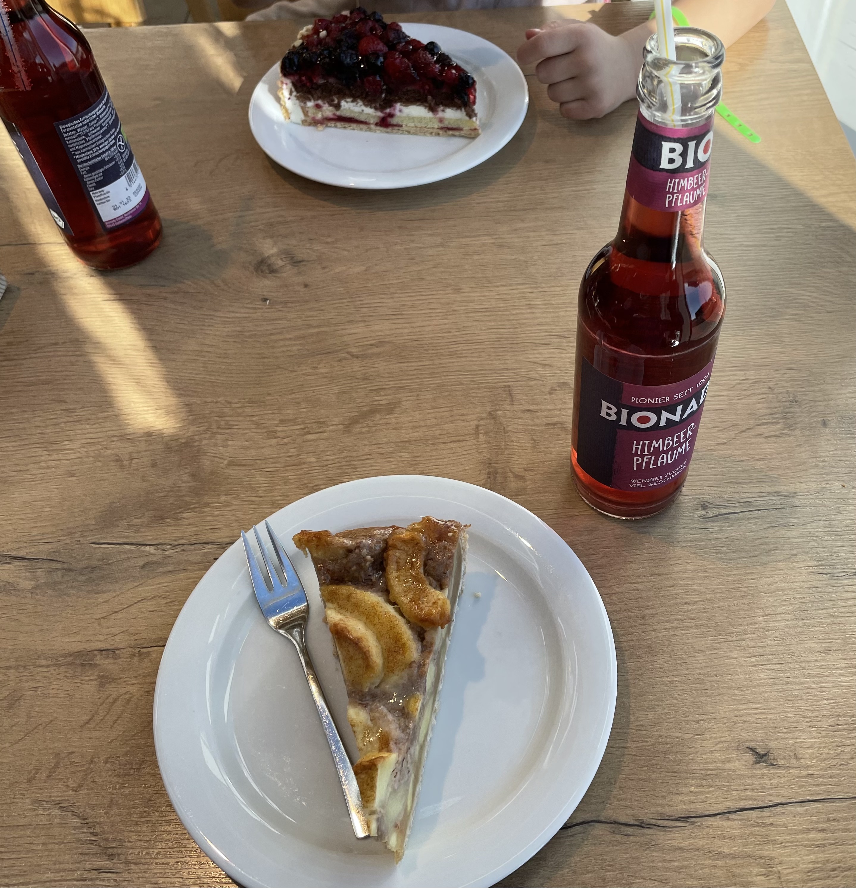 Gestern holte ich L am frühen Nachmittag vom Kindergarten ab und sammelte mit ihr C und ihren Sohn M ein. Kurz darauf machten wir uns gemeinsam auf den anderthalbstündigen Weg zum kinderfreundlichen Hotel. Als wir ankamen, waren unsere Zimmer schon bezugsfertig. Nachdem wir das Gepäck auf die Zimmer brachten, aß jeder ein Stück leckeren Kuchen in einem der Restaurants der großen Anlage. (Für mich gab es ein Stück vom veganen Apfelnusskuchen. <3) Wir ließen die Kinder noch eine Weile draußen in der Sonne spielen, ehe wir den hoteleigenen Indoorspielplatz vor und nach dem Abendessen aufsuchten. Halb zehn lag L dann neben mir im Doppelbett und es dauerte nicht lange, bis sie (und auch ich) schlief.