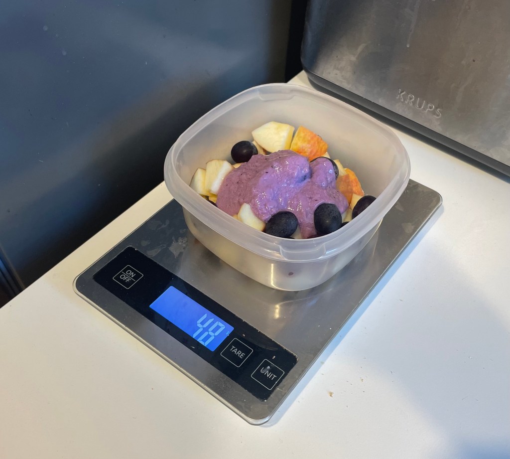 Aufgewacht und aufgestanden sind L und ich heute Morgen um kurz nach sieben. Unsere morgendliche Routine beinhaltet den Gang ins Bad mit der sogenannten Morgentoilette, aber natürlich auch die Zubereitung des Frühstücks. L bekam ein Vollkorntoast mit Margarine und Heidelbeermarmelade, ich bereitete mir für die Arbeit Haferflocken mit Obst und Sojajoghurt zu. Da ich aktuell wieder meine Kalorien tracke, kommt meine Küchenwaage täglich zum Einsatz.