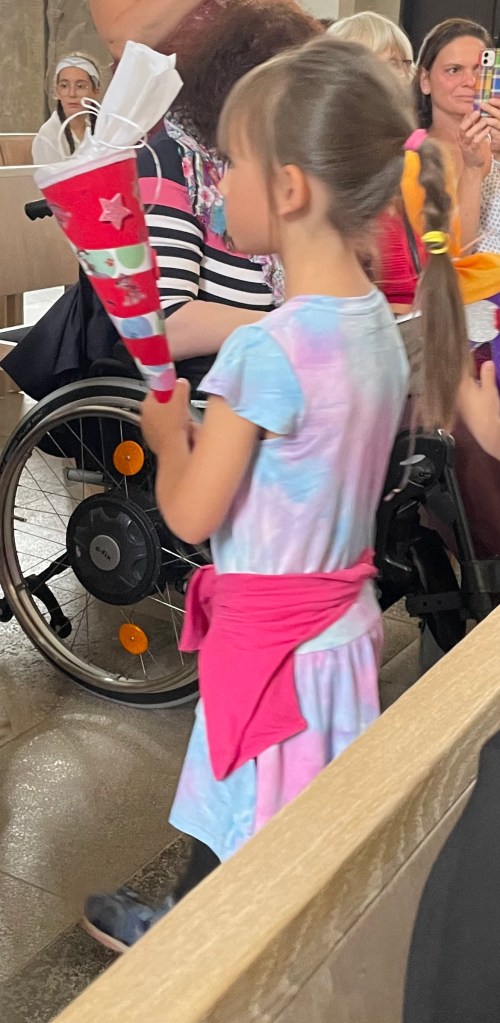 Der Pfarrer gestaltete den Gottesdienst, an dessen Ende die Kinder Zuckertüten überreicht bekamen, die wir Eltern zuvor im Rahmen eines Informationsnachmittags im Kindergarten bastelten, sehr liebevoll und interessant. Ich bin nicht in der Kirche und habe auch nicht vor, das zu ändern. Dennoch gefiel mir der Zuckertütengottesdienst ausgesprochen gut. Das lag sicherlich daran, dass meine L darin vorkam. 😉