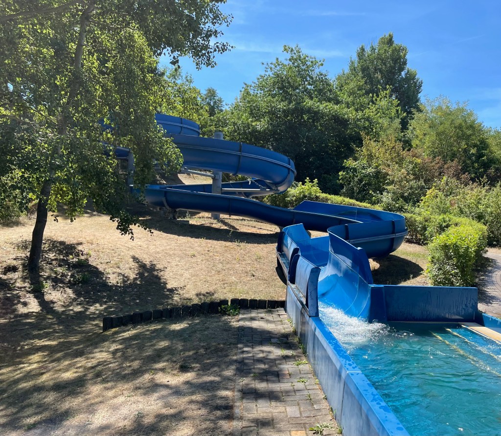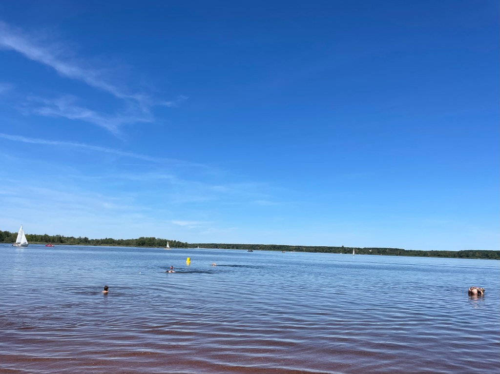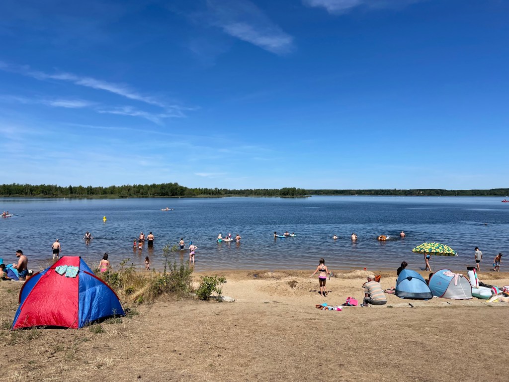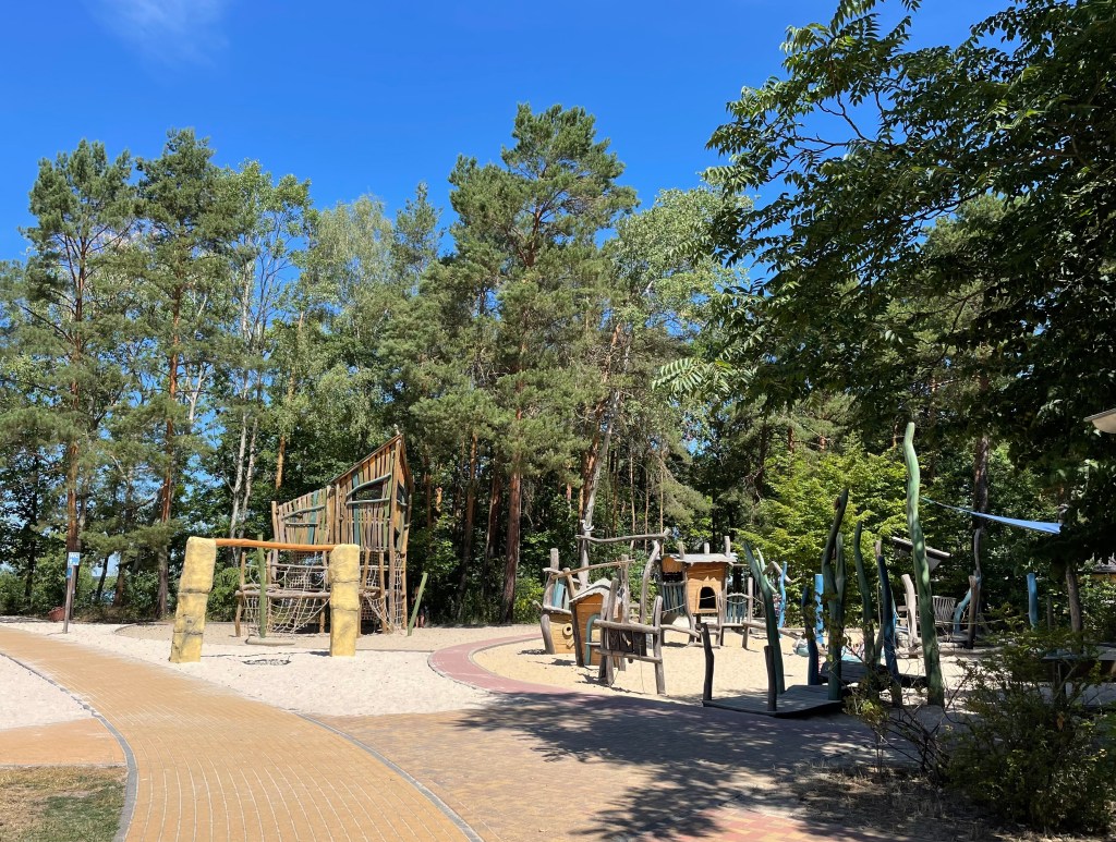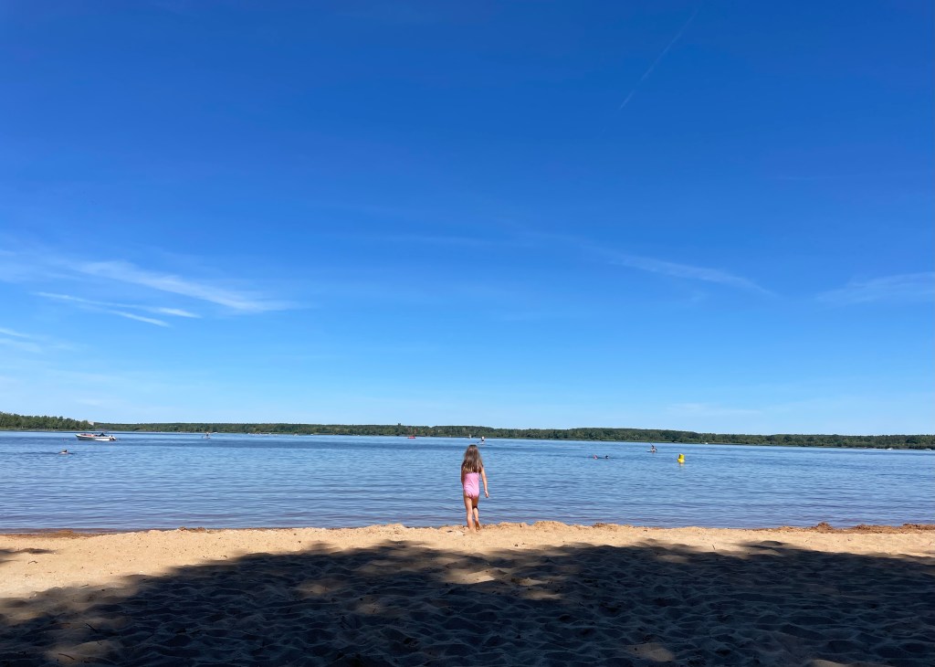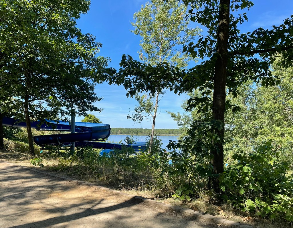 Um die Mittagszeit brachen alle in Richtung Badestrand Großkoschen am Senftenberger See auf. Dort entdeckten wir den wunderschönen Familienpark mit Unterkünften, Spielplätzen, Wasserrutsche, einem Zugang zum See, einem Campingplatz … Ich überlege, hier mit L im nächsten Jahr zu zelten. (Das ist das einzige, was ich mir leisten kann und will.) L schwamm wie eine Weltmeisterin und auch ich war dreimal im See baden. Der See ist wunderschön.