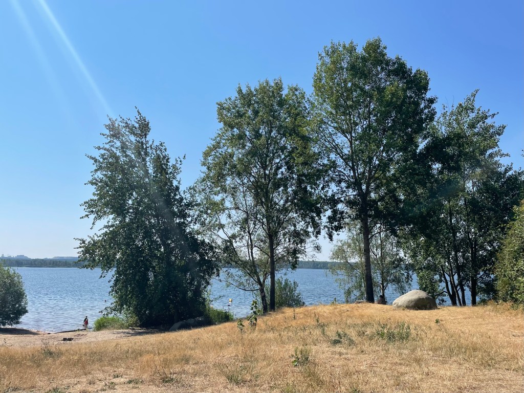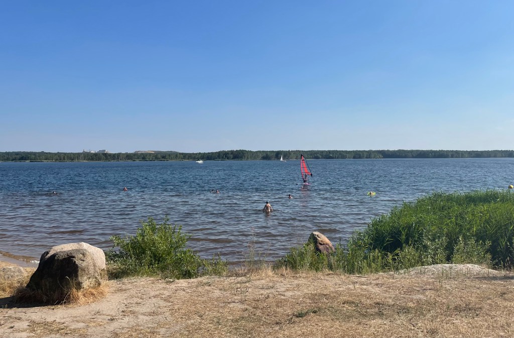 Am Vormittag fuhren wir mit den beiden Kindern und ihren Großeltern zum FKK-Strand Buchwalde am Senftenberger See. Das hatten wir gestern bereits ausgemacht. Ich war noch nie im FKK-Bereich baden. Dass es mir in den folgenden sechs Stunden überhaupt nichts ausmachte, nackt herumzuliegen und herumzulaufen oder andere Menschen nackt zu sehen, beweist, dass ich allmählich (in meiner Einstellung) älter werde. Vor einigen Jahren hätten mich meine Komplexe und Selbstzweifel niemals an solch eine Badestelle gelassen. Das Wasser war sehr angenehm. Ich ging fünfmal baden. (Normalerweise ist es eine Überwindung, ein zweites Mal ins Wasser zu gehen.) Da die Kinder die meiste Zeit über gemeinsam spielten, hatte ich Zeit, in meinem von J geschenkten Buch „Siddhartha“ zu lesen.