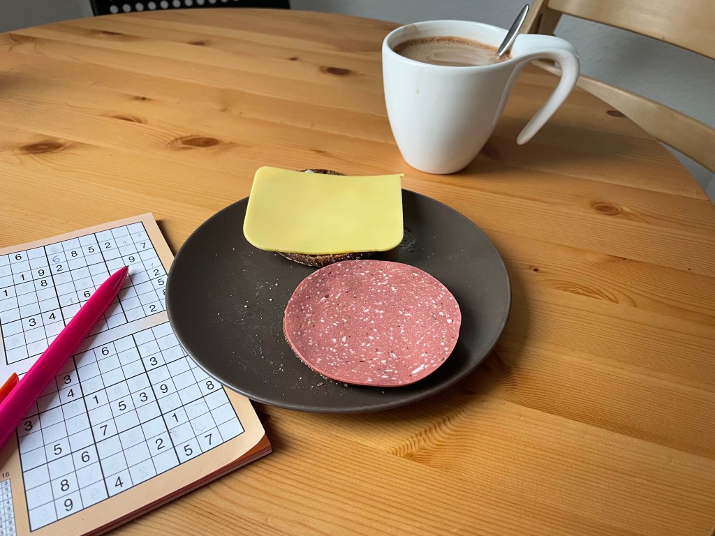 Durch die Verzögerung hatte ich etwas mehr Zeit für meinen Morgenspaziergang. Über kleinere Umwege und Seitenstraßen lief ich zurück zum S-Bahnhof und erfreute mich an der aufgehenden Sonne. Unterwegs entdeckte ich zwei schöne Spielplätze, die zwar zu den angrenzenden Wohnhäusern gehören, jedoch nicht eingezäunt sind. L und ich werden das bei Gelegenheit genauer unter die Lupe nehmen. Wie gestern auch schon machte ich es mir zu Hause in der Küche mit meinem Frühstück und den Sudoku-Rätseln gemütlich und startete in aller Ruhe in den Tag.