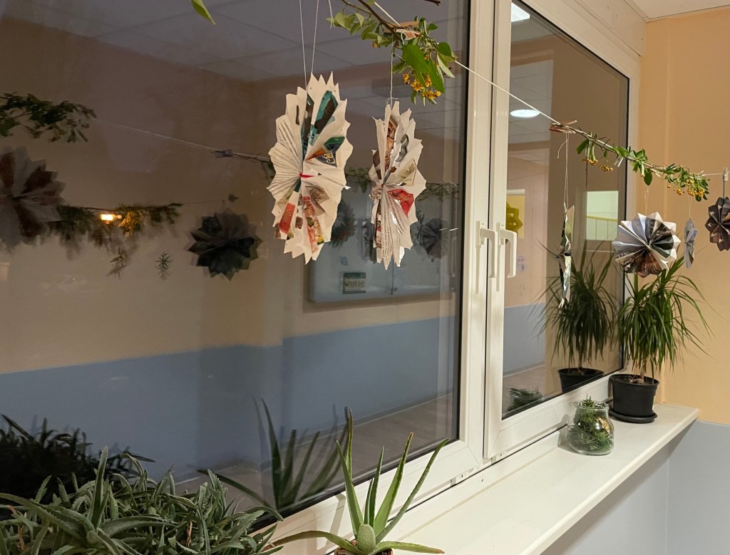 Die erste Bastelstation, bei der wir Halt machten, war im Hortraum von Ls Klasse. L und L bemalten, beklebten und verschönerten einen aus Holzstäben zusammengesetzten Weihnachtsbaum. Anschließend wurde L beim Kinderschminken auf eigenen Wunsch in einen Hasen verwandelt, der uns wenig später zwei Etagen weiter oben einen wunderschönen Adventskranz (für die Wohnungstür) gestaltete. Bei unserer letzten Station bastelte L einen weißen Stern aus zusammengeklebtem Butterbrotpapier.