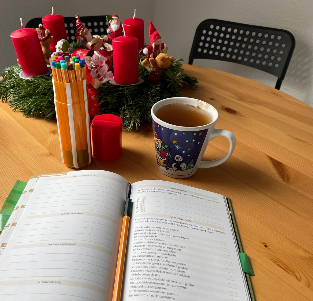 Nach dem Frühstück schnappte ich mir mein Buch “Ein guter Plan” und schrieb fleißig ein paar Momente auf, die ich in Zukunft nicht vergessen mag. Zwischendrin holte ich unsere Weihnachtsdekoration aus dem Keller und L begann, unsere Wohnung zu schmücken.