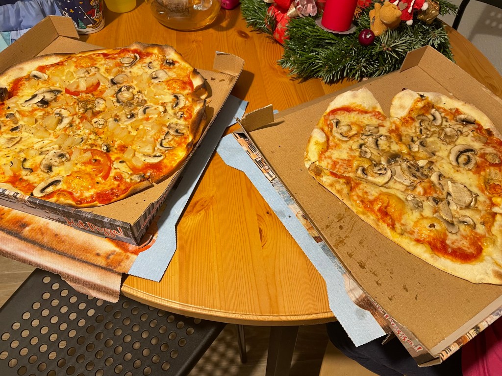 Halb sechs am Abend sollte der schulische Weihnachtsmarkt enden. Kurz vor sechs fanden wir uns erneut im Speiseraum zum Pizza essen (ich war leider immer noch satt) ein. L und L aßen aber mit großem Appetit.