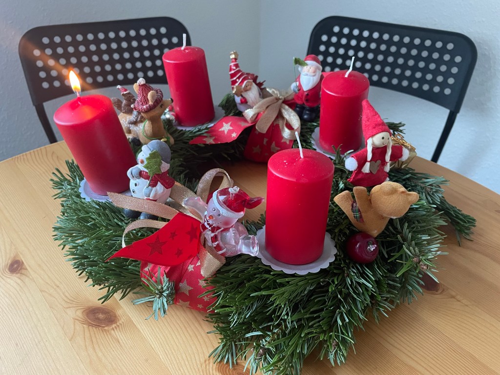 Erst halb zehn frühstückten wir gemeinsam die restlichen Pizzastücke. Die erste Kerze auf unserem schönen, von meinem Papa selbstgebastelten Adventskranz leistete uns mit ihrem hellen Licht Gesellschaft.