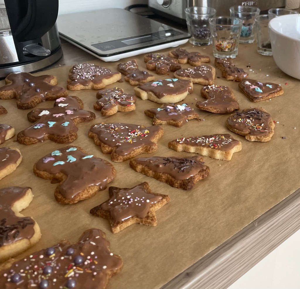 Da wir gestern nicht alle Plätzchen verziert hatten, widmeten wir uns mittags dem Rest. L half wieder sehr schön mit.