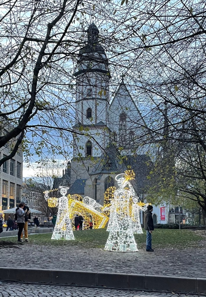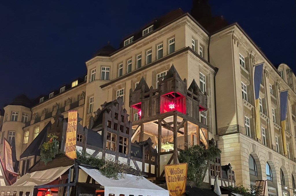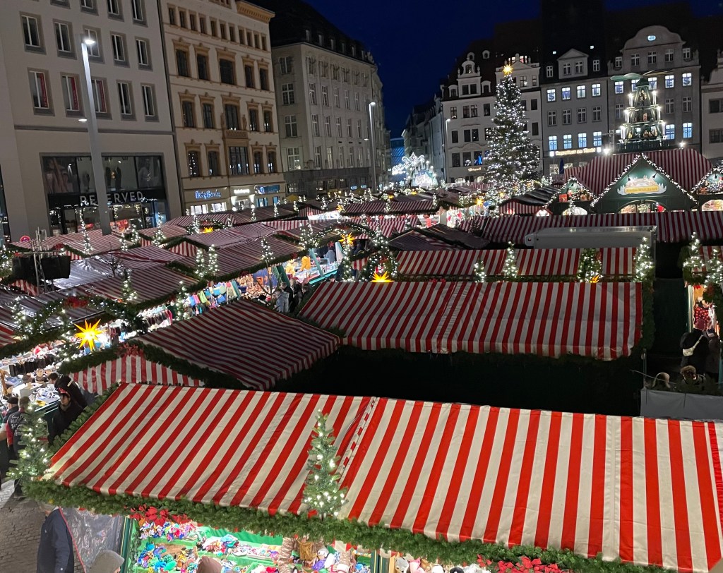 Ich nähte anschließend die Träger an Ls Weihnachtsbeutel fest, da dieser uns unbedingt auf den Leipziger Weihnachtsmarkt begleiten sollte. Ich gebe zu, es war nur eine mittel gute Idee, am späten Nachmittag des ersten Advents den Weihnachtsmarkt zu besuchen. L und ich wurden mehr geschoben als dass wir selbst liefen. Zudem waren die schillernden Farben und Habseligkeiten an jedem zweiten Stand zu viel für L. Sie wollte alles haben. Das wurde mir sehr schnell zu anstrengend. Wir kauften uns Süßigkeiten, fuhren mit dem kleinsten Riesenrad der Welt, kauften den zehnten Schlüsselanhänger für L und fuhren dann mit der S-Bahn wieder nach Hause. Der nächste Besuch wird unter der Woche stattfinden und nicht am Wochenende.