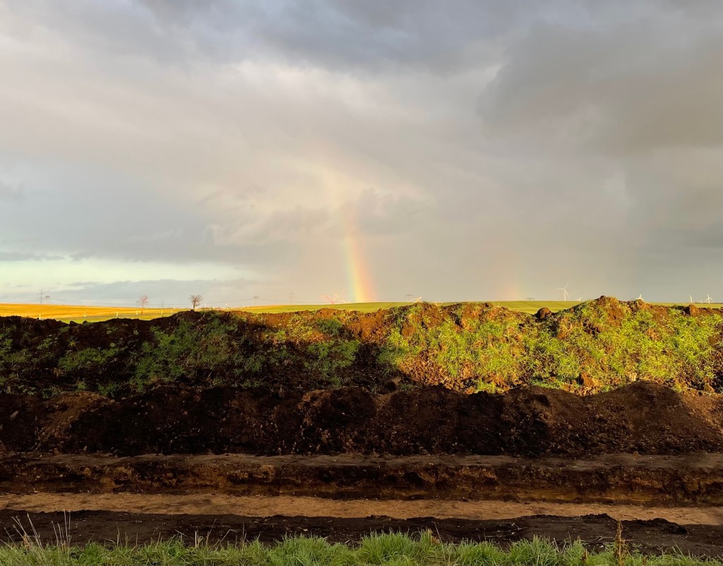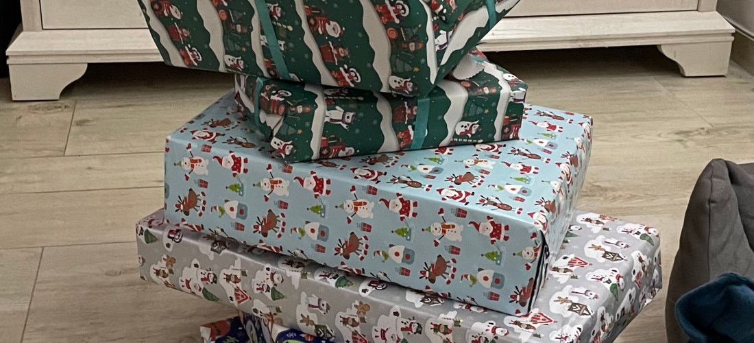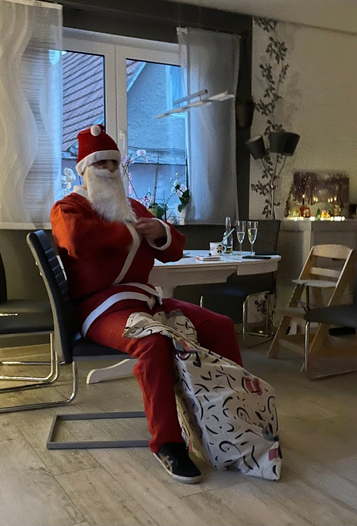 Um 14 Uhr holten wir Ls Oma M ab und fuhren mit ihr zu Ls Tante, ihrem Onkel S und ihrem Cousin M. Ls Opa D war bereits da. Wir starteten unsere Zusammenkunft mit einem leckeren Kuchen. Die Kinder waren unfassbar aufgeregt und fragten alle paar Minuten, wann denn der Weihnachtsmann die Geschenke bringt. Einen unbeobachteten Moment nutzte ich aus, um mich noch mal heimlich zum Auto zu schleichen und unseren Geschenkesack zu holen. Auf dem kurzen Weg dorthin wurde ich mit einem schönen Regenbogen überrascht und war mir sicher, dass M auch Teil unseres Weihnachtsfestes ist.