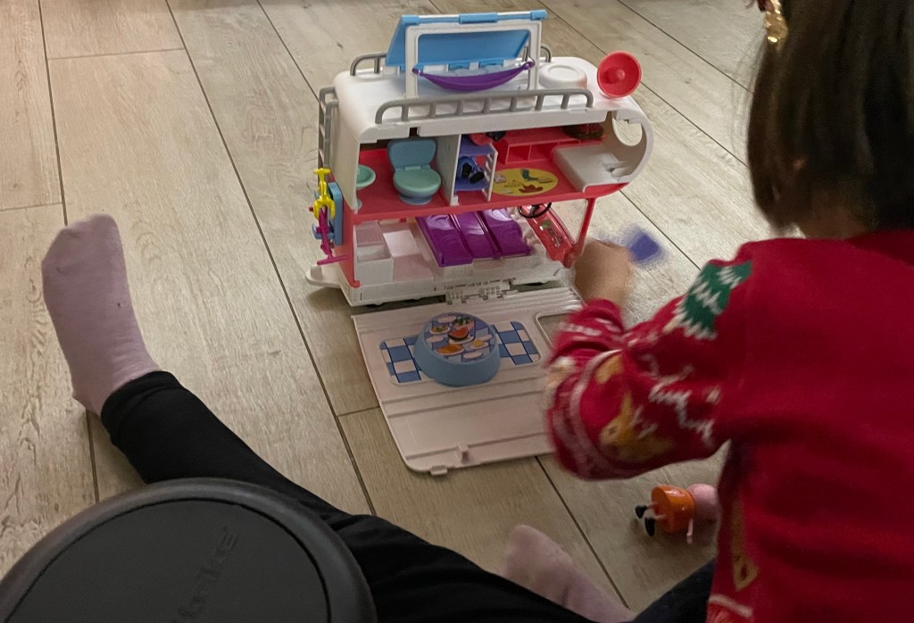 Um Viertel nach vier war es endlich soweit. Es rumpelte im Kamin und klopfte kurz darauf an der Tür. Und da war er. Der Weihnachtsmann. L und ihr Cousin M zeigten überhaupt keine Angst oder Schüchternheit, sagten ihre Gedichte auf oder sangen Lieder und wurden reichlich beschenkt. L, die sich seit dem Sommer das Peppa Wutz Wohnmobil wünscht, freute sich riesig, als sie dieses unter ihren Geschenken fand. Die Kinder spielten sofort mit ihren neuen Sachen und Ls Cousin M zeigte sehr großes Interesse an dem Wohnmobil.