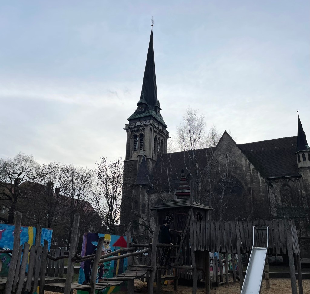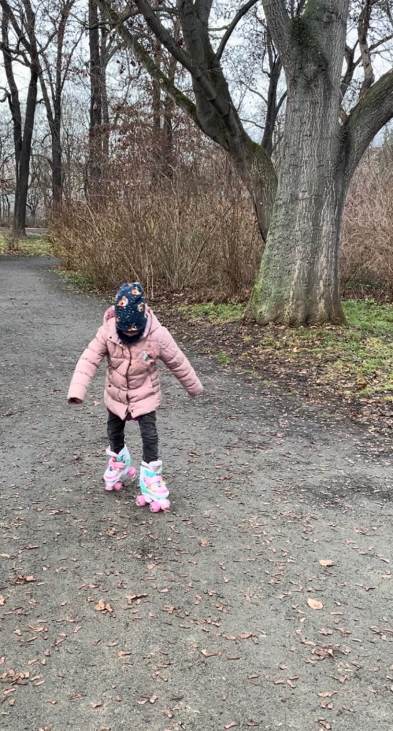 Kurz vor halb zwei waren wir schon wieder zu Hause. L spielte mit ihrer neuen Puppe und dem Peppa Wutz Wohnmobil. Um meinen Eltern etwas Mittagsruhe zu ermöglichen, schnappten uns L und ich ihre neuen Rollschuhe und liefen zum nahegelegenen Spielplatz bei der Thomaskirche. Der Aufenthalt im Freien tat uns beiden sehr gut.