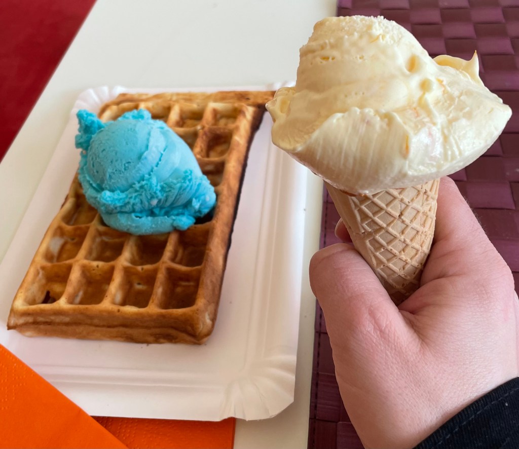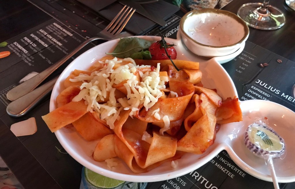 Gemeinsam liefen wir bei herrlichstem Sonnenschein die Nikolaistraße entlang und kehrten in einem italienischen Restaurant ein, um eine Kleinigkeit zum Mittag zu essen. Zum Nachtisch holten L und ich uns jede noch eine Kugel Eis auf die Hand. Eine Kugel Eis kostet in dieser Saison offenbar 1,80 Euro … Einfach nicht darüber nachdenken.