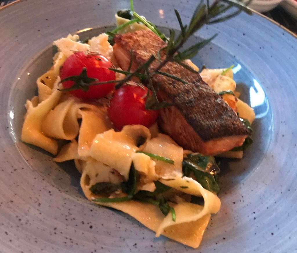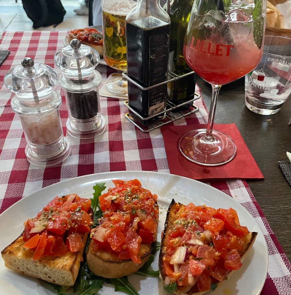 Nach unserem Spaziergang fuhren wir mit dem Auto zum Markkleeberger See, der heute ganz ruhig lag. L durfte sich noch eine Weile auf dem Spielplatz austoben, ehe wir in ein gehobenes italienisches Restaurant einkehrten. Ich trank zweieinhalb Gläser von drei unterschiedlichen hausgemachten Limonaden und genoss Gnocchi mit Spinat, Tomaten und Tofuspießen.