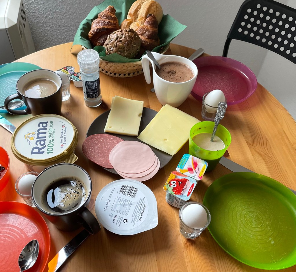 L und ich frühstückten gegen acht Uhr bei einem Conni-Hörspiel.