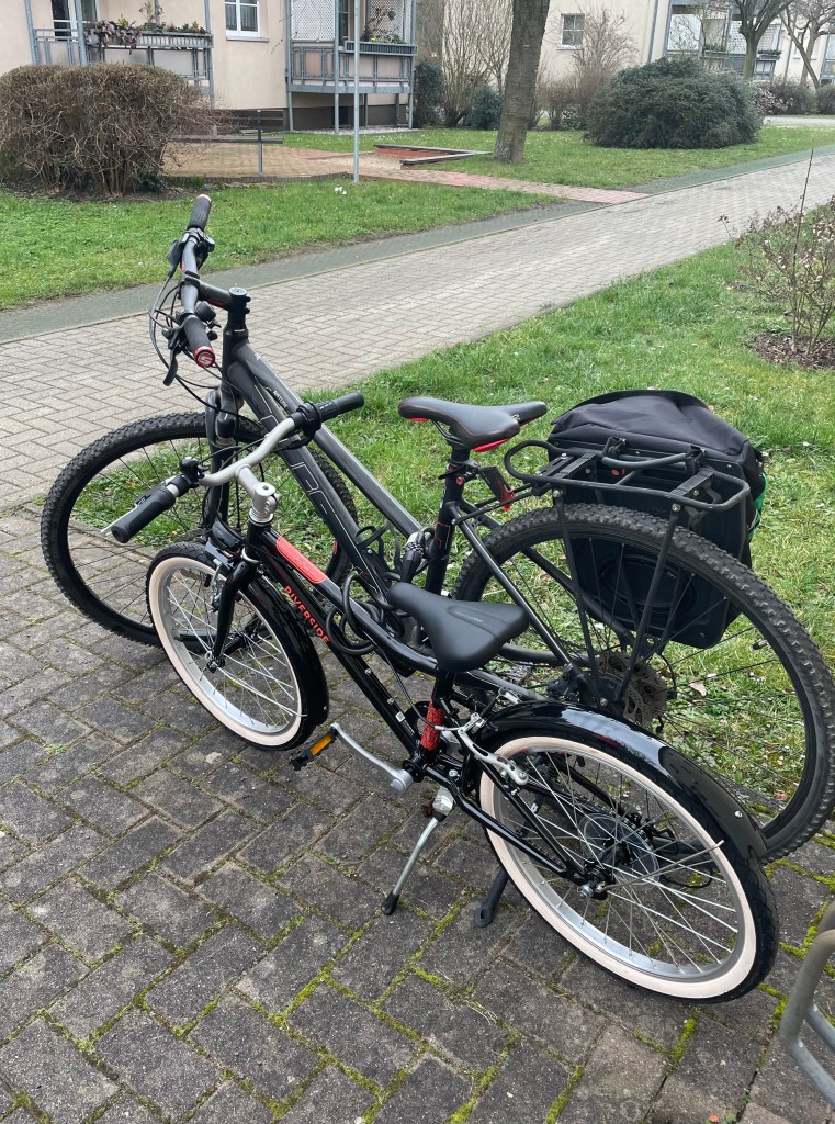 Nach der Verabschiedung meiner Eltern und dem kurzen Rückweg zur Wohnung holte ich direkt Ls neues und mein acht Jahre altes Fahrrad aus dem Keller. Luft war noch zur Genüge auf den Reifen. Wir schnappten unsere Fahrradhelme und packten eine Fahrradtasche mit Proviant, einem Kuscheltier und unseren Regenjacken und starteten in die erste Fahrradtour des Jahres UND unseres Umzugs nach Markkleeberg.