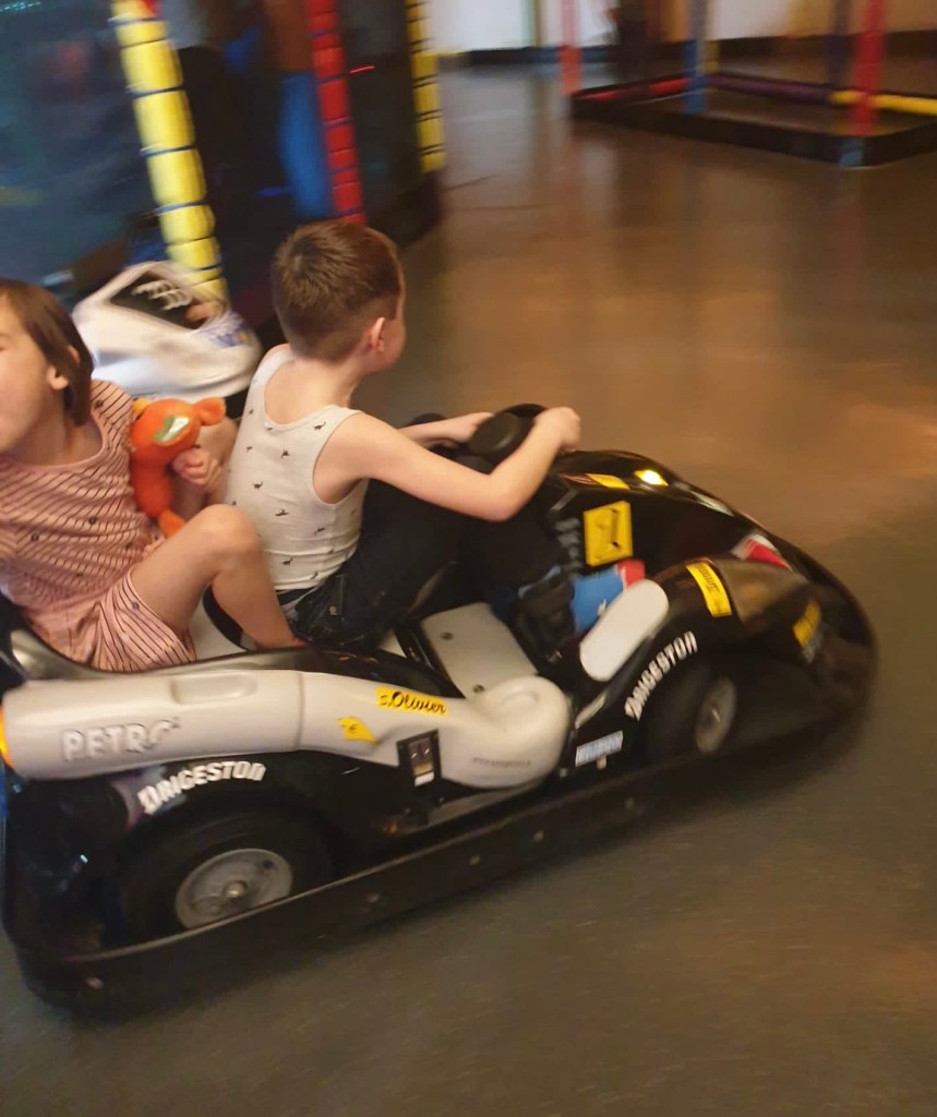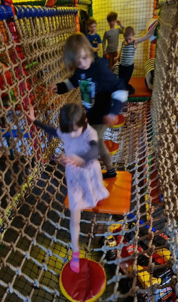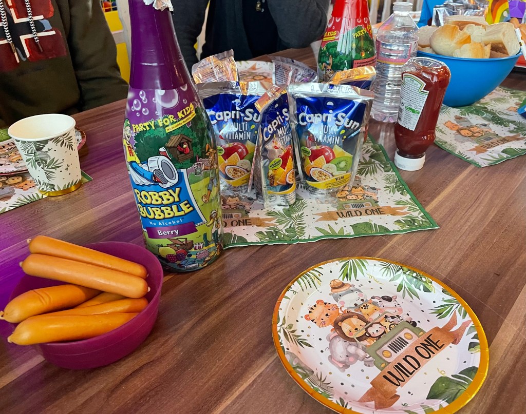 Nachdem sich die Kinder umgezogen hatten, flitzten sie auch schon davon. Wir Erwachsenen nutzten die Zeit und deckten die zwei Tische ein. (Im Kinderland Erfurt ist es erlaubt, Speisen, Getränke und Deko mitzubringen.) Zum Trinken, zum Essen und zum Geschenke auspacken sahen wir die Kinder kurzzeitig. Ansonsten waren sie die vier Stunden unseres Aufenthaltes im Spielbereich verschwunden. Alle Kinder hatten großen Spaß, es gab keine Verletzungen und nur wenig Tränen. Eine gelungene erste Kindergeburtstagsfeier also. Gegen achtzehn Uhr räumten wir zusammen. Nach und nach wurden die Kinder abgeholt.