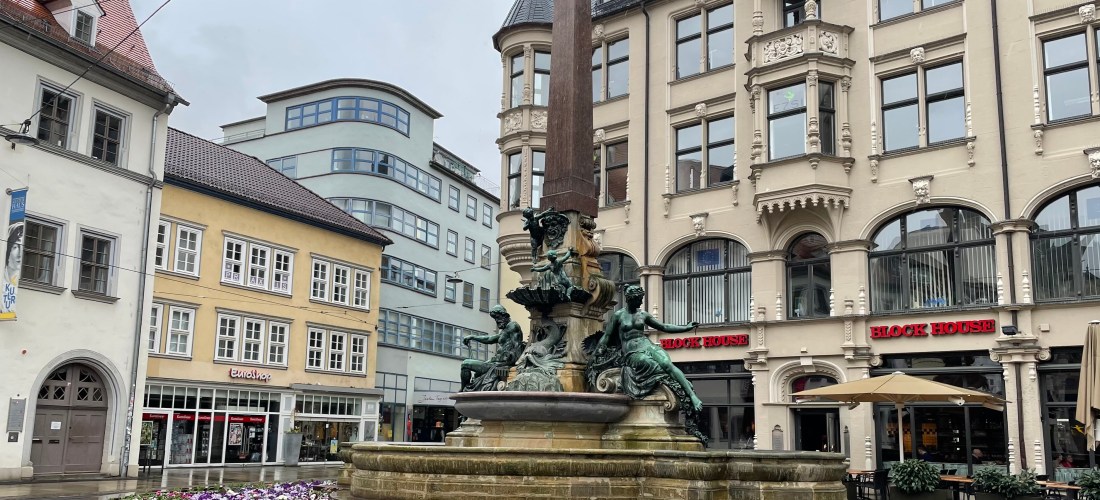 Am Nachmittag waren wir mit Ls Opa D verabredet. Wir trafen uns in der Erfurter Altstadt in der Nähe des Angerbrunnens und besuchten ein Eiscafé. L aß Spaghettieis mit Erdbeeren, D einen Amarena-Eisbecher und ich einen Schoko-Eisbecher.