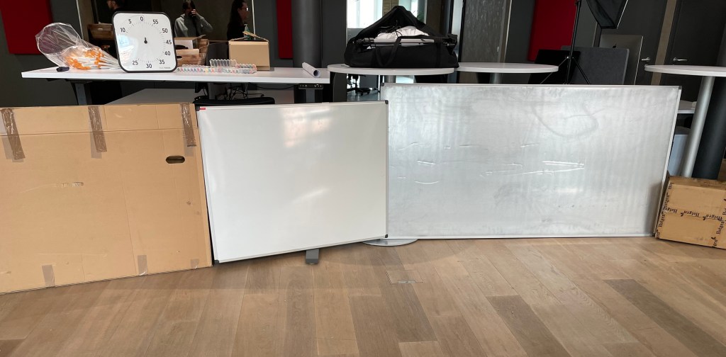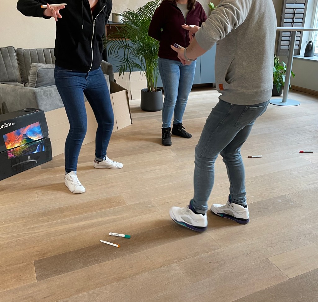 Alle drei Wochen findet unser Teammeeting statt. Das heutige wurde ausschließlich in persönlicher Anwesenheit im Büro veranstaltet. Zu Beginn kämpften wir mit je zwei Fingerstieren, die Stifte balancierten, gegeneinander. Das war sehr lustig, da die oder der ein oder andere stellenweise mit fiesen Tricks arbeitete. Gewonnen hatte das Spiel meine Kollegin N.